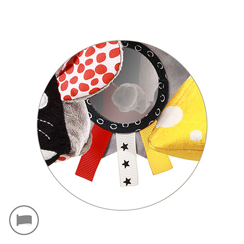 Nasza kontrastowa zawieszka do wózka to sensoryczna karuzela pełna niespodzianek! Zabawa z wesołą myszką rozbudza wyobraźnię, stymuluje zmysły i wspiera rozwój motoryczny Twojego maluszka. Wyposażyliśmy ją w dwie grzechotki i szeleściki, które pobudzają słuch, kolorowe metki i zakręcony ogonek motywujące do chwytania, a także bezpieczne lusterko do poznawania własnego odbicia. Stworzyliśmy ją w kontrastowych kolorach i z geometrycznymi wzorami, by rozwijała wzrok już od pierwszych miesięcy życia. Zawieszkę dla niemowląt przyczepisz do wózka i fotelika, zapewniając rozwojową zabawę na spacerze i w podróży.