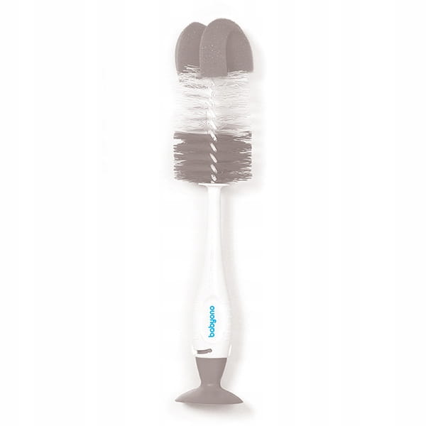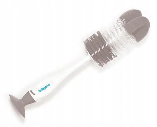 Szczotka z przyssawką „SAMOSTOJĄCA" pomaga w dokładnym czyszczeniu zarówno butelki, jak i smoczka. Szczotka posiada przyssawkę, która umożliwia przyczepienie jej do płaskich powierzchni, dla ułatwienia osychania. Szczotka do butelki jest zakończona miękką gąbką, która dostosowuje się do kształtu butelki. W uchwycie rączki jest schowana mała szczotka do czyszczenia smoczka. Miękkie włosie szczotek i gąbka docierają do trudno dostępnych miejsc. Szczotki wykonane są z trwałych i bezpiecznych materiałów, nie zawierających Bisfenolu A.