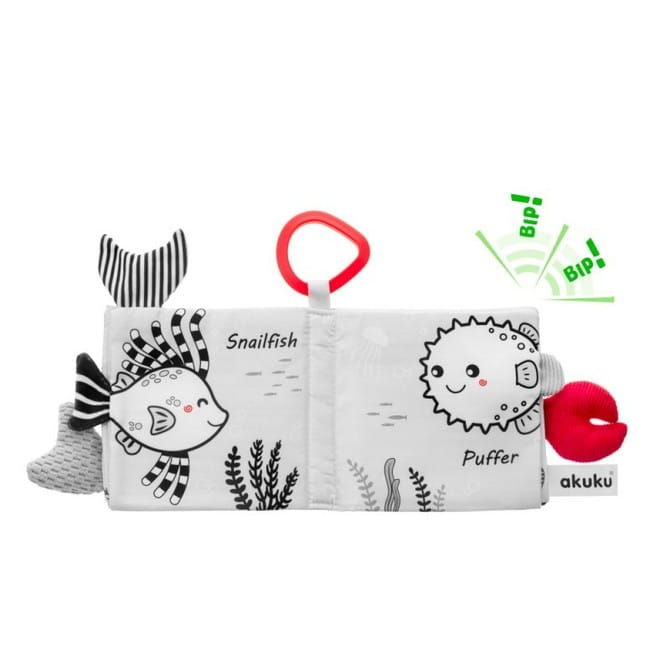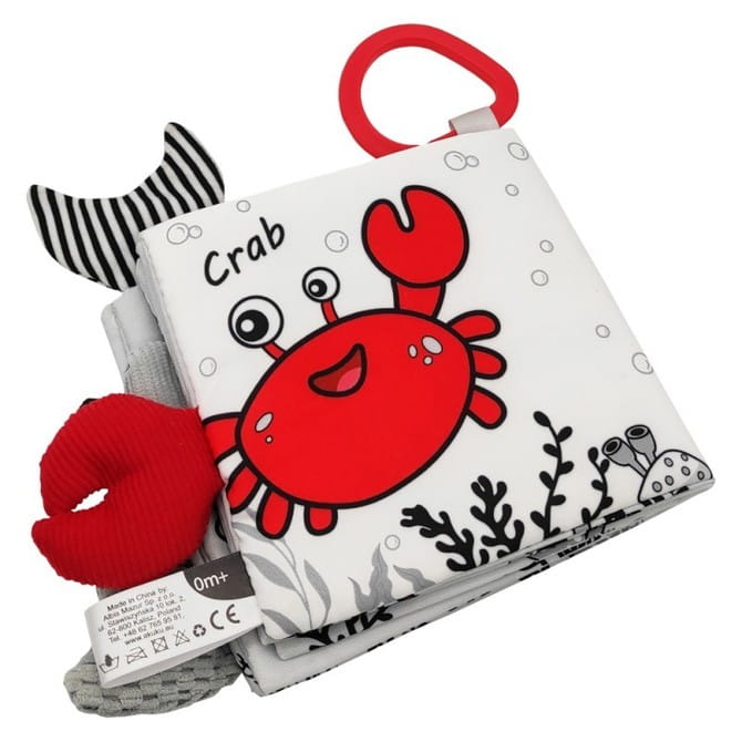 Kontrastowa książeczka sensoryczna Zwierzęta Morskie to świetna zabawka dla najmłodszych dzieci, które dopiero uczą się poznawać świat. Jest pełna niespodzianek, które zaciekawią Twojego maluszka. Pobudzenie zmysłu dotyku wpływa na prawidłowy i harmonijny rozwój Twojego dziecka. Znajdziesz w niej materiały o różnych fakturach i właściwościach, takie jak piszczek, grzechotka oraz elementy szeleszczące i liczne wypustki. Zabawka wspiera rozwój maluszka już od pierwszych dni, stymuluje wzrok dzięki specjalnie zastosowanym kolorom, które niemowlę widzi od urodzenia. Doskonale pobudza rozwój koordynacji wzrokowo-słuchowej i motorycznej dziecka. Jest idealna do nauki chwytania i odkrywania ciekawych dźwięków i kształtów. Praktyczny zaczep umożliwia przypięcie zabawki przy wózku lub łóżeczku. Jest delikatna i miła w dotyku.