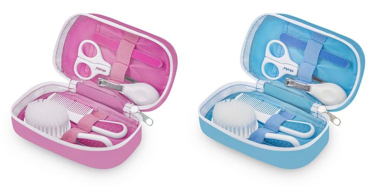 Zestaw do pielęgnacji Twojego dziecka wwygodnej ipraktycznej kosmetyczce. Nożyczki (o cienkich metalowych ostrzach izaokrąglonych krawędziach) orazcążki pomogą pewnie ibezpiecznie obciąć drobne paznokcie, apilniczek złatwością usunie nierówności paznokcia chroniąc dziecko przed zadrapaniem. Natomiast miękka szczotka orazgrzebyk zantypoślizgowym uchwytem pozwolą zatroszczyć się ogłówkę maleństwa. W celu zminimalizowania ryzyka niespodziewanego poruszenia się dziecka, zaleca się obcinanie paznokci podczas snu. Produkt dostępny wdwóch kolorach: niebieski iróżowy.