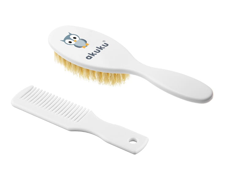 Bezpieczna i delikatna szczotka do czesania dziecięcych włosów wykonana z naturalnego włosia w zestawie z grzebieniem. Miękkie włosie idealnie nadaje się do pielęgnacji delikatnych włosków niemowlaka, a dzięki właściwościom antystatycznym nie elektryzuje ich. Grzebyk natomiast posiada zaokrąglone końce, przez co chroni delikatną skórę dziecka. Dostępna w dwóch kolorach: niebieska i biała.