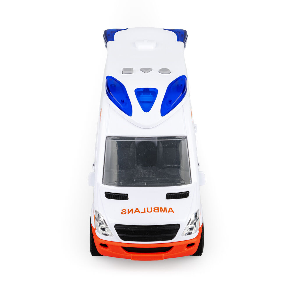 Zabawkowa karetka pogotowia zachęci malucha do zabawy w odgrywanie ról, pomagając mu przy tym w rozwijaniu wyobraźni! Ten realistycznie wyglądający pojazd wyposażony został w funkcje, upodabniające go do pełnowymiarowego ambulansu. Poza ręcznie otwieranymi tylnymi i bocznymi drzwiami, znajdziemy tu w zestawie rozkładane nosze. Pojazd posiada na dachu przyciski, aktywujące realistyczne odgłosy i światełka. Jakby tego było mało, karetka potrafi sama jechać do przodu! Wystarczy, że rozpędzisz jej koła, poprzez tarcie nimi o podłoże i postawisz ją na podłodze, a pojedzie przed siebie.