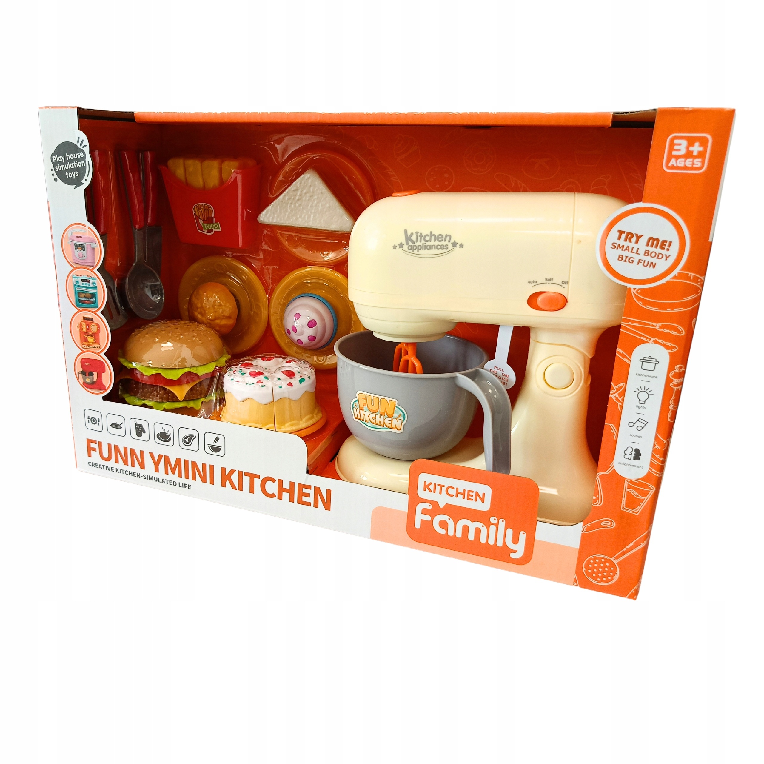 W komplecie znajdziesz wiele akcesoriów, które urozmaicą zabawę – cztery talerzyki, plastikową kanapkę tostową, babeczki, torcik do krojenia, hamburgera, który można rozkładać, oraz zestaw frytek. Dodatkowo w zestawie znajdują się niezbędne narzędzia kuchenne: nóż kucharski, łyżka wazowa i łopatka do przewracania.