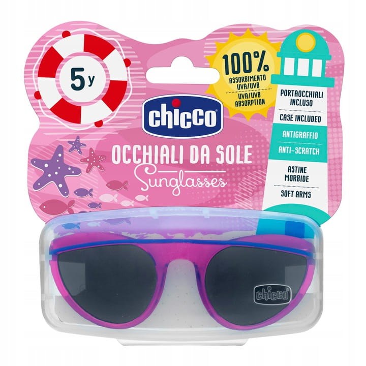 Chicco oferuje gamę okularów przeciwsłonecznych, które gwarantują wysoką ochronę delikatnych oczu dziecka (filtr kategorii 3), soczewki z poliwęglanu są odporne na zarysowania, chronią przed promieniami UVA i UVB a miękka i elastyczna ramka jest idealna dla delikatnej twarzy dziecka (0+ i 12+)