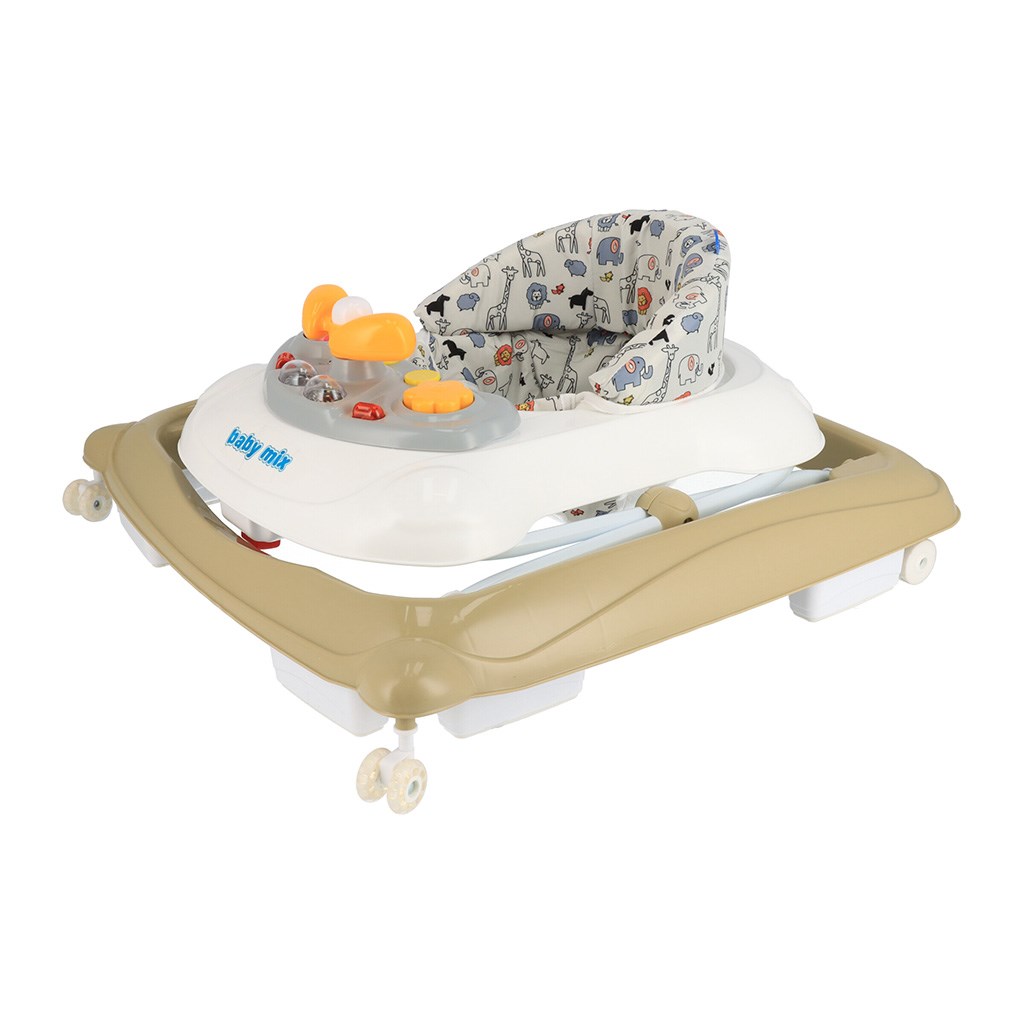 Multifunkcyjny chodzik dziecięcy Baby Mix z silikonowymi kółkami ułatwia naukę chodzenia. Chodzik został wyposażony w wygodne, specjalnie wyprofilowane siedzonko które zapewnia odpowiednią postawę dla kręgosłupa. Wielofunkcyjny panel zabawowy: z efektami świetlnymi, kierownicą z klaksonem, którą można obracać, kwiatek, grzechotkę, dwa przyciski, które grają melodie i dwa światełka. Piękny chodzik z zabawkami oczaruje małych odkrywców i pozwoli im bawić się jeszcze dłużej. Jeździk został wyposażony w specjalny system zabezpieczający przed wywrotką, który zapewni komfort i bezpieczeństwo maluchowi.