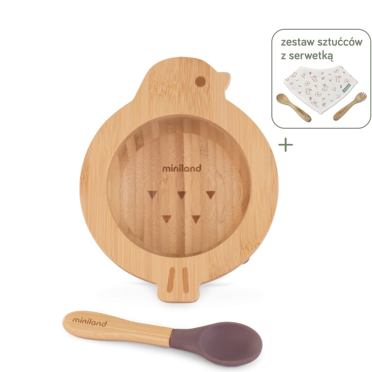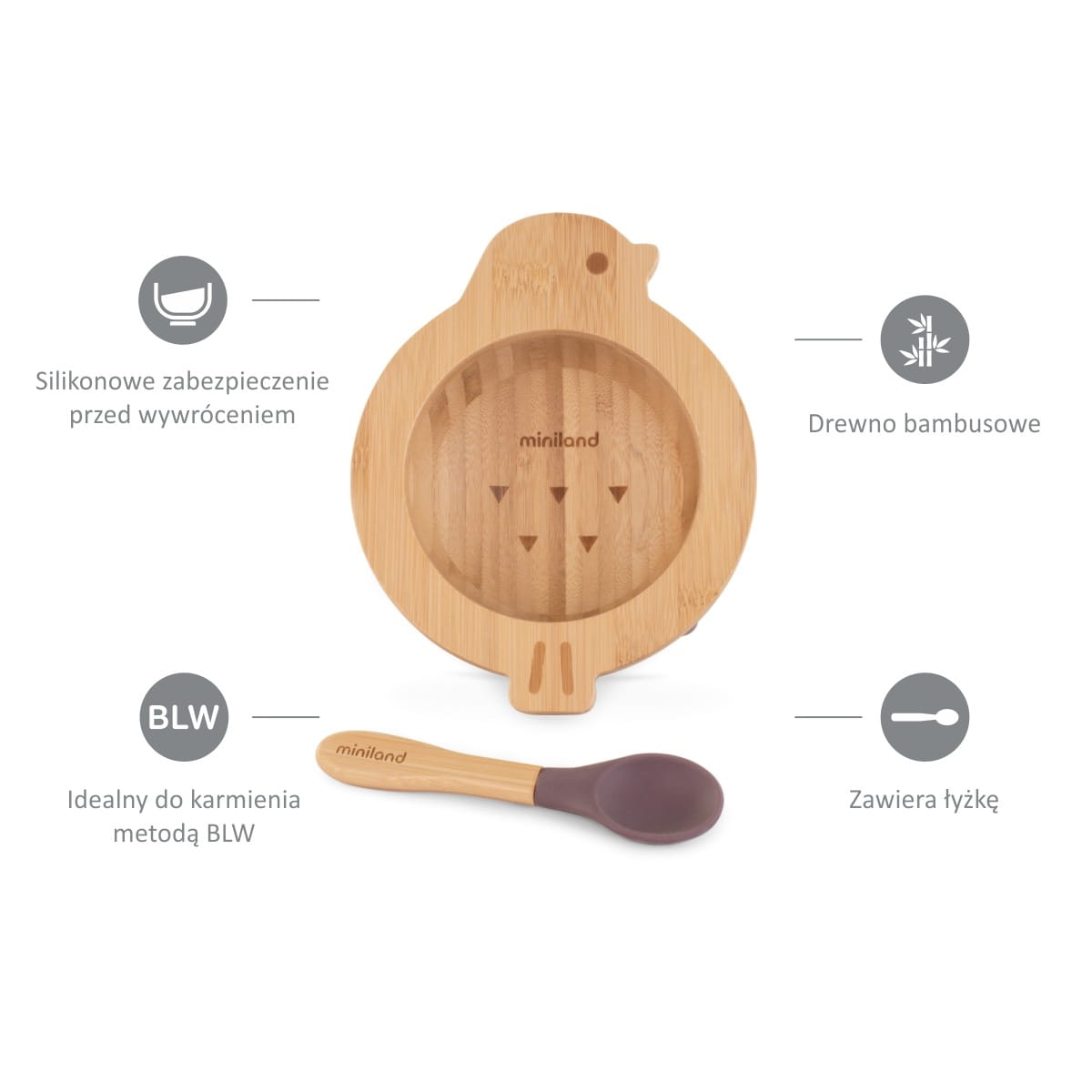 Miska i łyżka wykonane są w 100% z bambusa, a przyssawki i końcówka łyżki z silikonu spożywczego.
