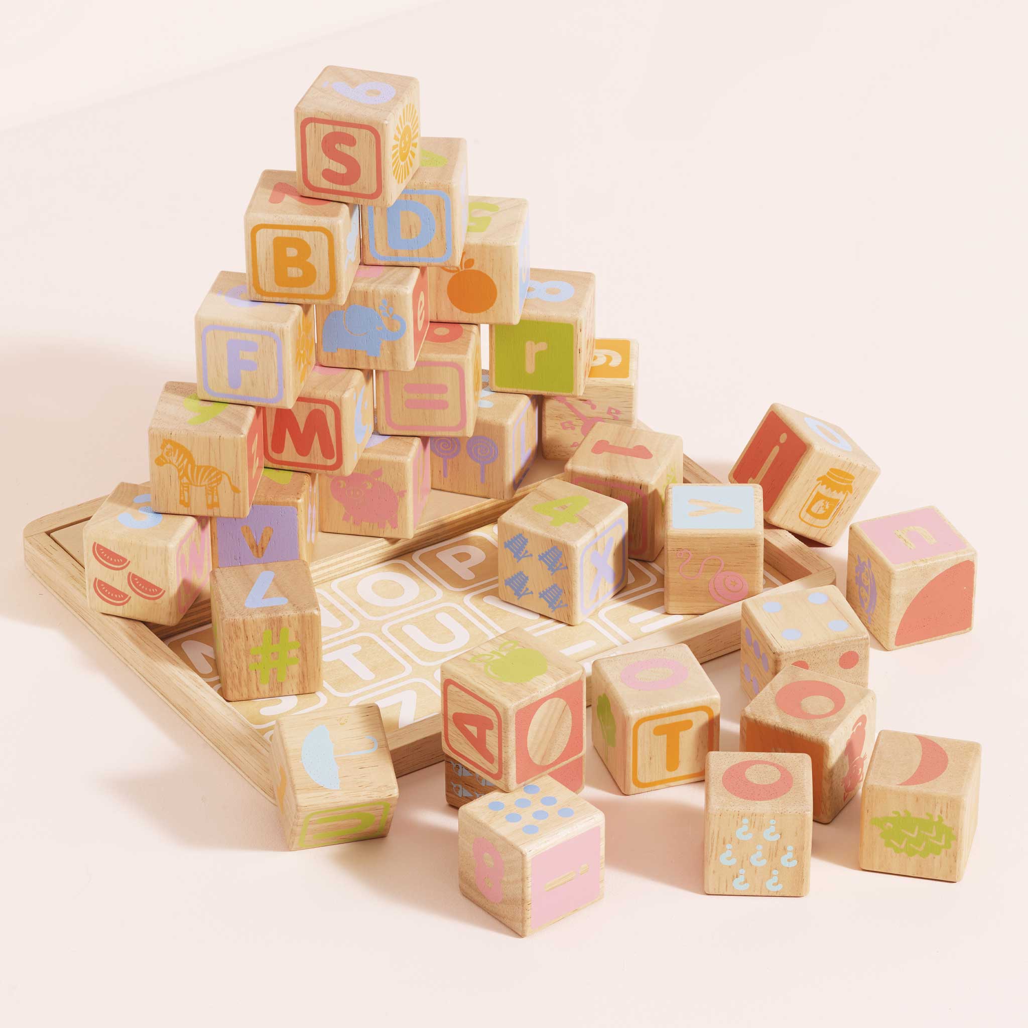 Zestaw zawiera 30 drewnianych klocków oraz tacę z wyrysowanymi literkami, dzięki czemu po skończonej zabawie można je wszystkie odłożyć na miejsce i oferuje nieograniczone możliwości nauki, zabawy oraz kreatywnego budowania różnych konstrukcji.