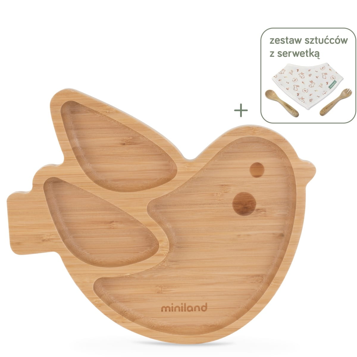 Bambusowy talerzyk w formie ptaszka został stworzony z naturalnego drewna specjalnie dla niemowląt, jest niezwykle pojemny, w sam raz na dziecięcą porcję jedzenia i posiada certyfikat FSC.