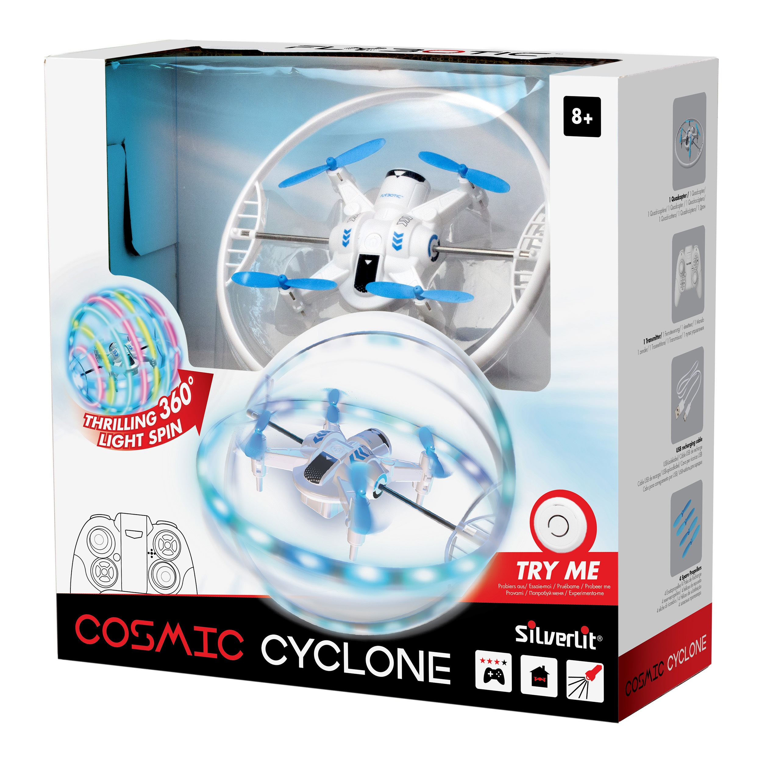 Czujesz powiew dobrej zabawy? W blasku świateł nadciąga Kosmiczny Cyklon! Zdalnie sterowany pojazd latający wyposażony jest w cztery śmigła oraz podświetlaną obręcz, która zapewnia aż 7 różnych efektów świetlnych. Cyklon potrafi zawisnąć w powietrzu i latać we wszystkich kierunkach, a to za sprawą 4 kanałów sterowania, w które został wyposażony. W zabawce zastosowano technologię żyroskopową, która odpowiada za precyzję sterowania. Pojazd działa na częstotliwości 2.4 GHz, należy się nim bawić wewnątrz pomieszczeń.