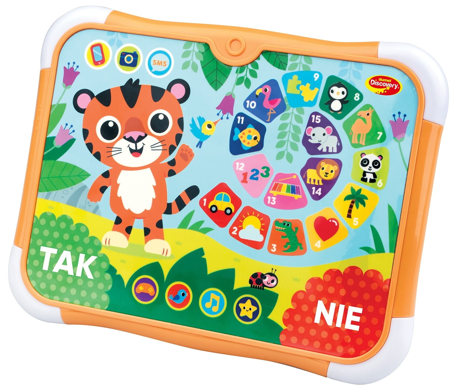 Tygrysek ukrył w labiryncie pytań zagadki z przeróżnych kategorii. Zmierz się z wyzwaniem, odpowiadając na pytania, poprzez naciskanie przycisków TAK i NIE. Poza trybem gry, na sprytne szkraby czekają tu też wesołe dźwięki i melodie. Narożniki tabletu świecą kolorowo, umilając zabawę. Zabawka została wyposażona w regulację głośności, a także w praktyczną, rozkładaną podstawkę, co pozwoli dostosować tablet do indywidualnych potrzeb malucha.