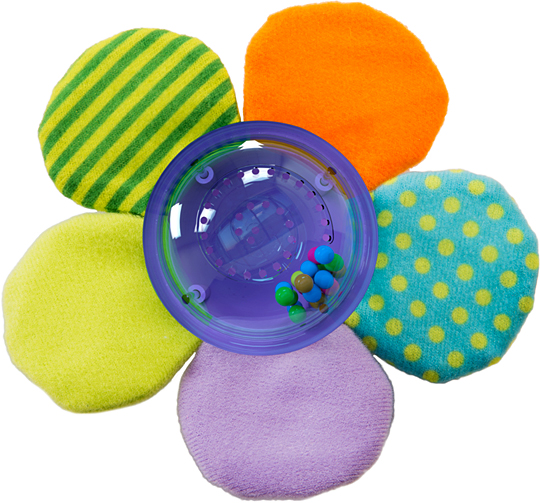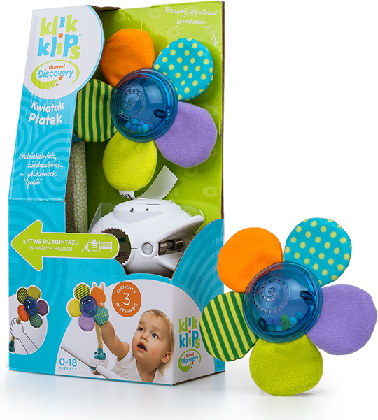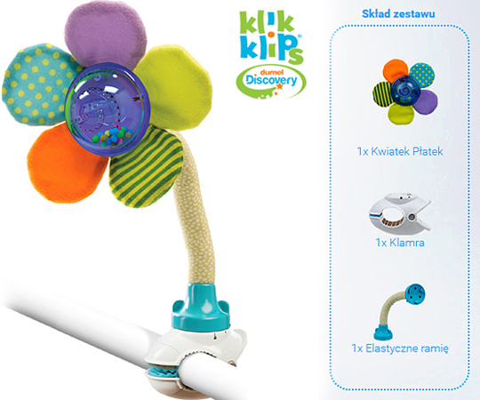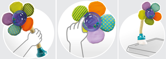 • w zestawie - grzechotka w kształcie kwiatka, giętkie ramię i klamra do mocowania