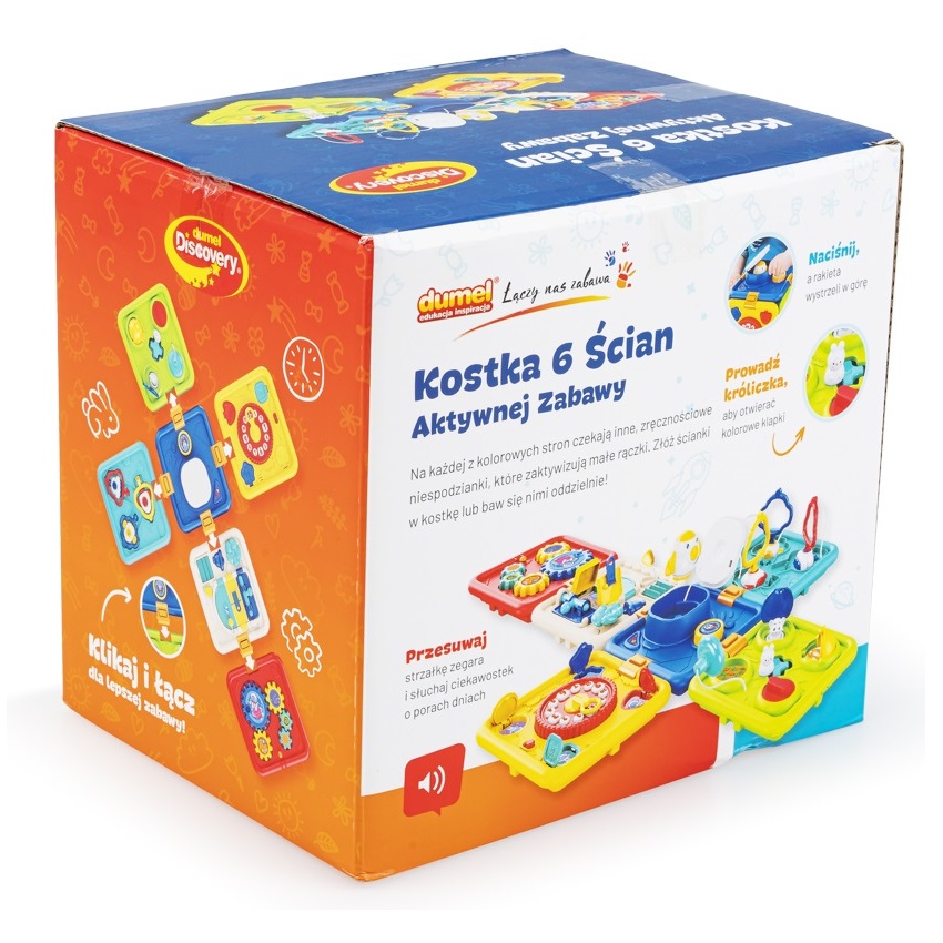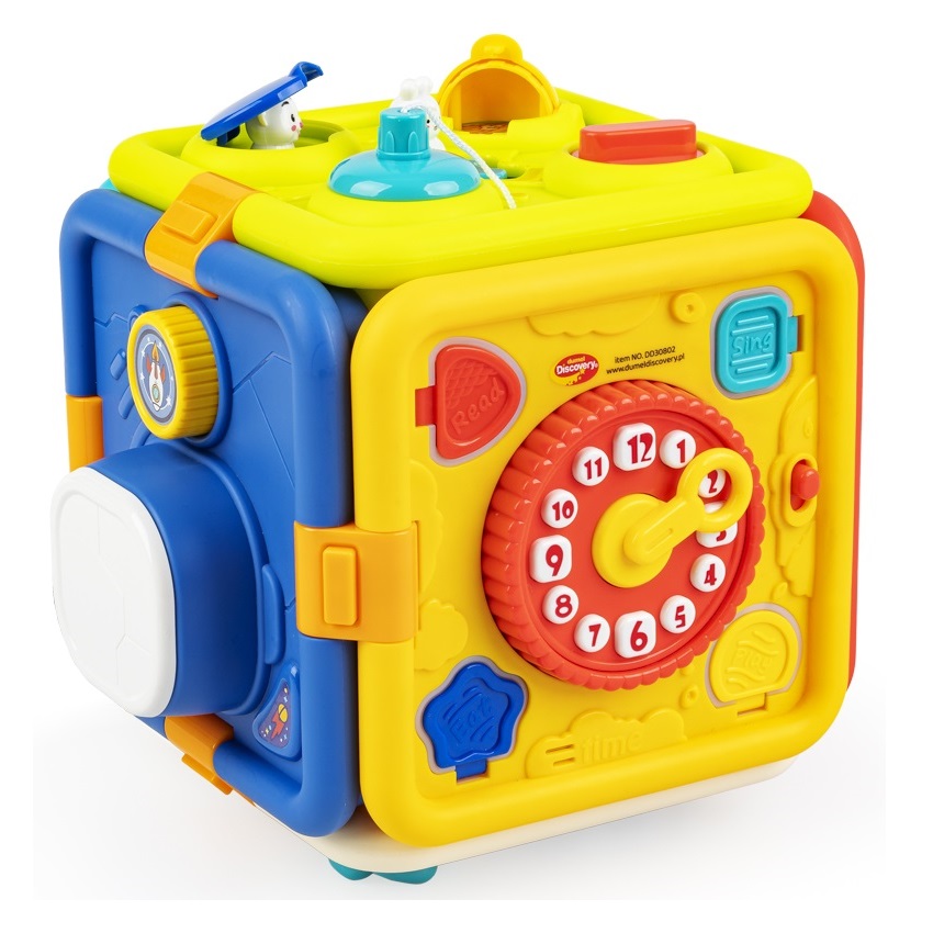 Pomysłowa Kostka umożliwia zabawę na wiele różnych sposobów. Na każdej z jej ścianek znajdują się inne, praktyczne zadania, z którymi maluch może ćwiczyć sprawność paluszków, poznawać zależności przyczynowo - skutkowe i rozwijać swoje zdolności poznawcze. Czeka tu uroczy króliczek, którego należy przeprowadzić przez labirynt, aby otworzyć kolorowe klapki, rakieta, która po naciśnięciu przycisku wyskakuje w górę oraz zegar opowiadający o porach dnia i czynnościach z nimi związanymi. Dodatkowo, znajdują się tu kluczyki, do dopasowywania i przekręcania, drzwi do otwierania na kilka sposobów, żaluzje do odsłaniania oraz kolorowe trybiki do kręcenia. A co najlepsze, ścianki zabawki można połączyć ze sobą w kostkę lub odpiąć którąś z nich i bawić się nią oddzielnie! To rozwiązanie z pewnością sprawdzi się w podróży lub w przypadku korzystania z zabawki na niewielkiej przestrzeni.