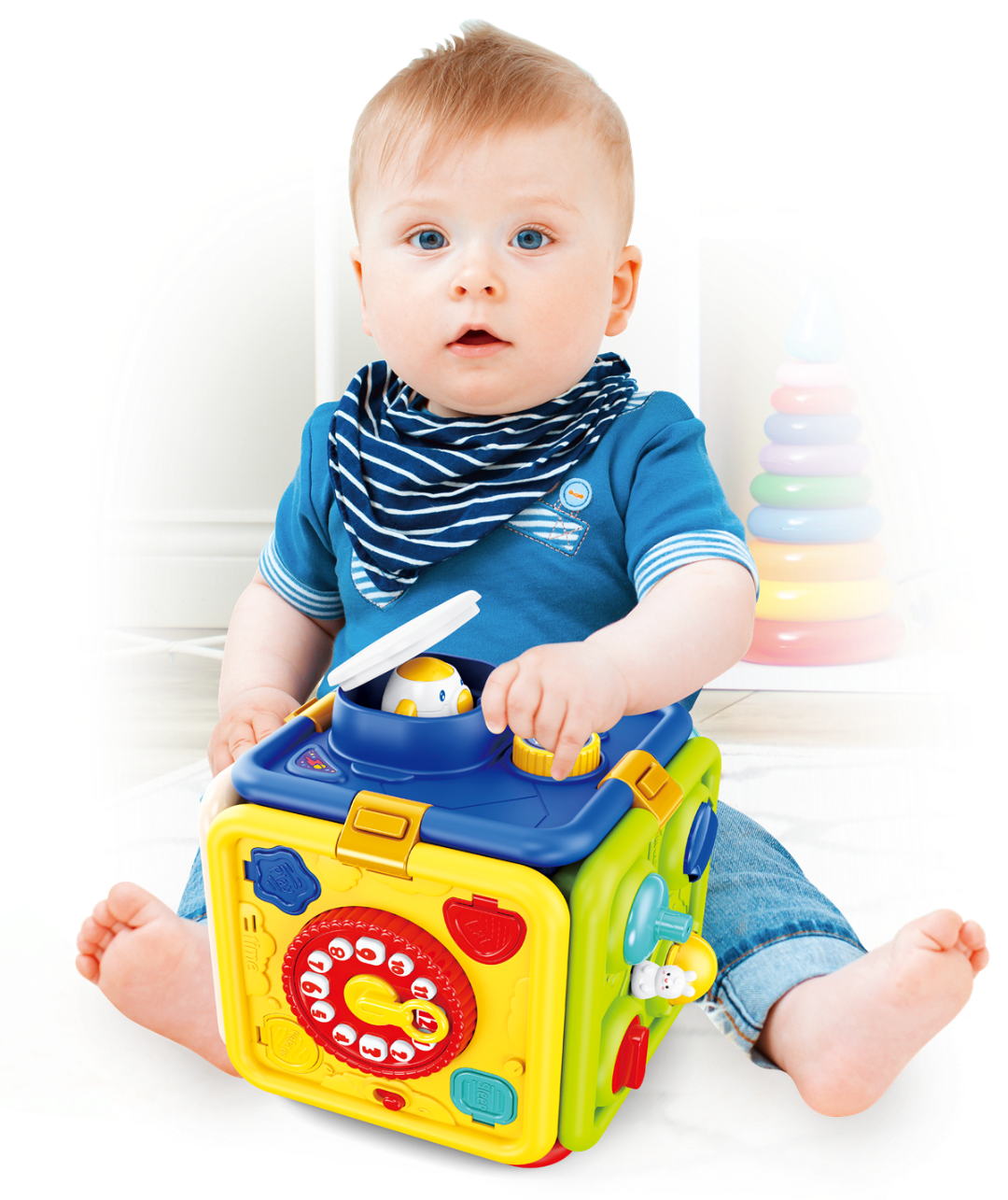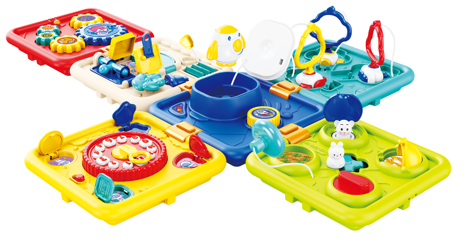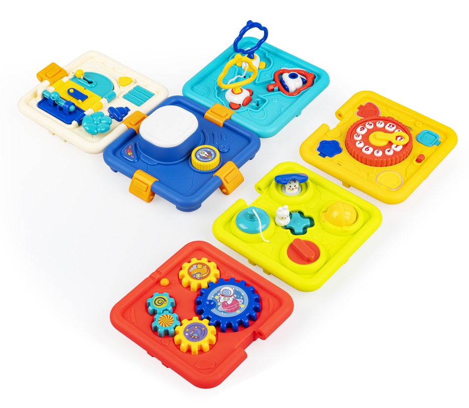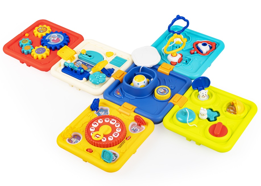 - 6 ścianek, a na każdej z nich inna zabawa: 1) naciśnij, a rakieta wystrzeli w górę, 2) prowadź króliczka, aby otwierać kolorowe klapki, 3) przesuwaj strzałkę zegara i słuchaj ciekawostek o porach dniach, 4) dopasuj i przekręć kluczyki, 5) odsłoń żaluzje, zamykaj i otwieraj drzwi na różne sposoby,