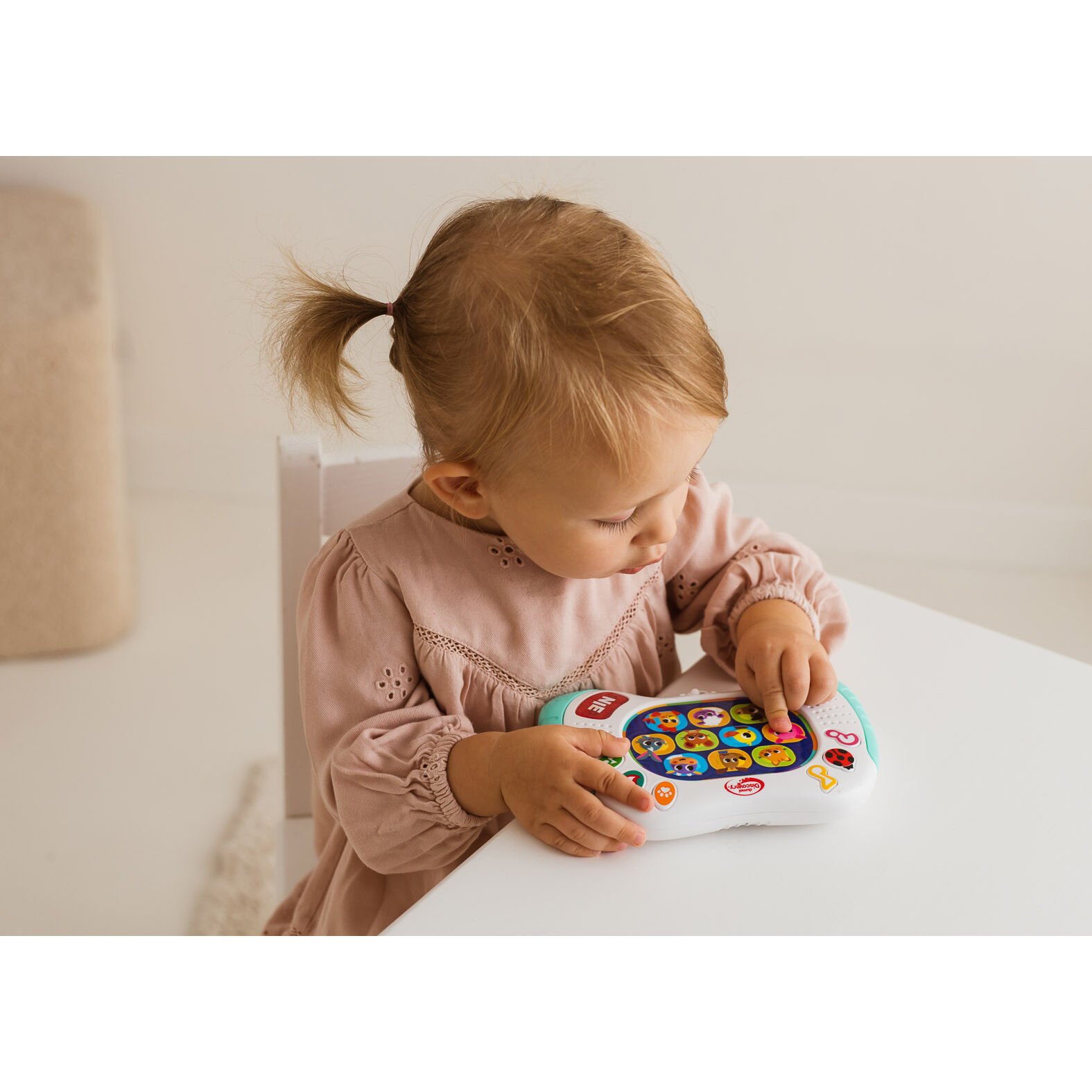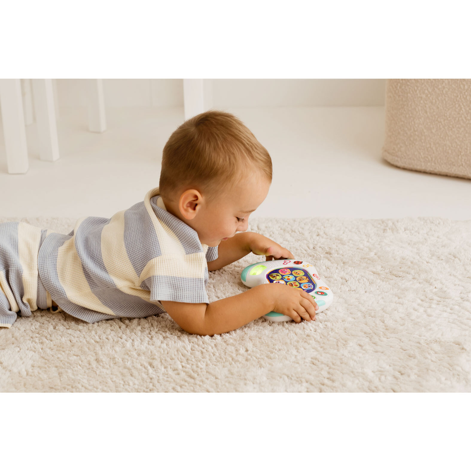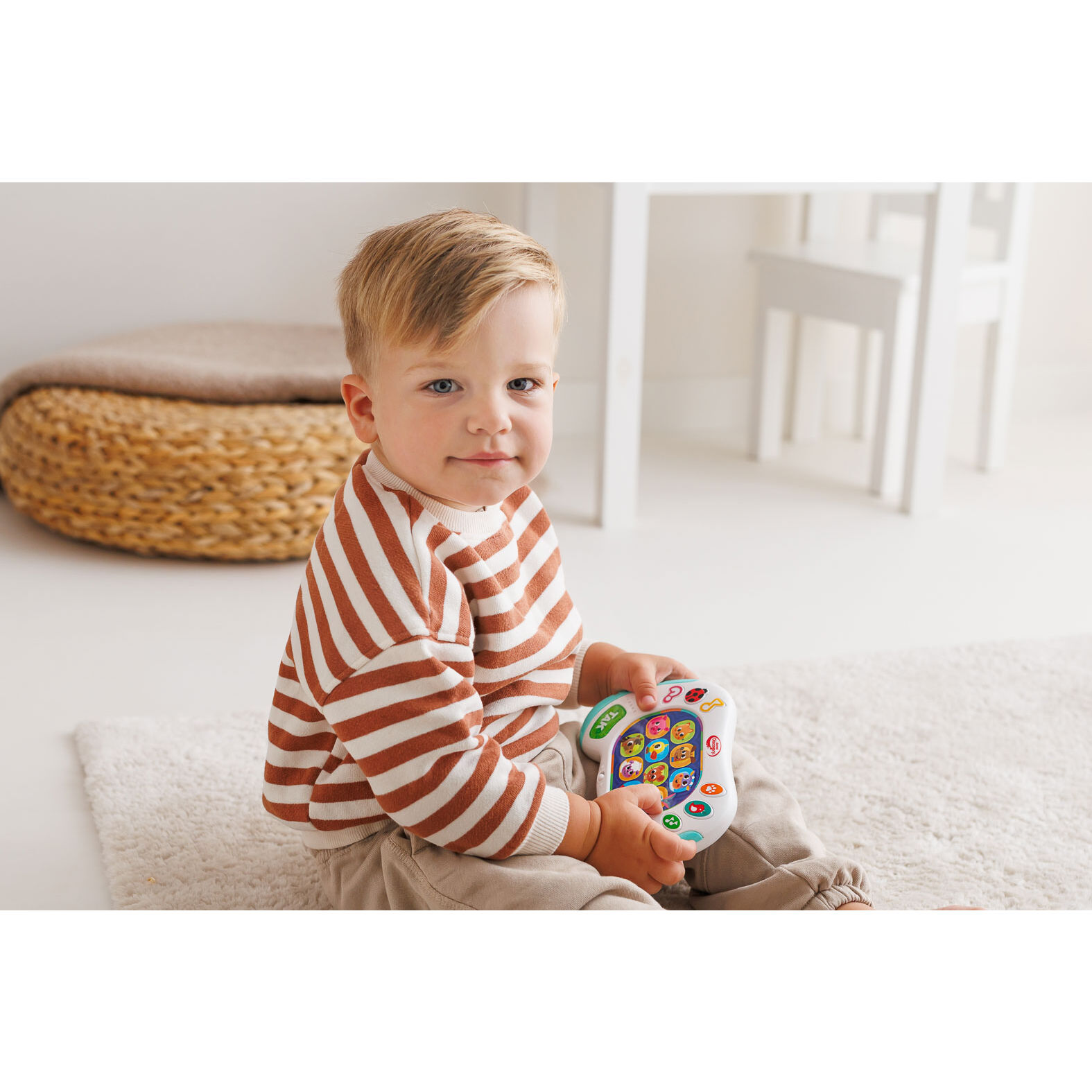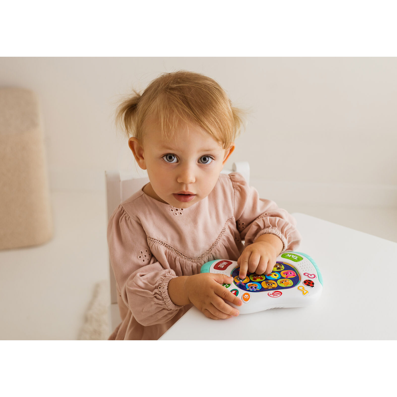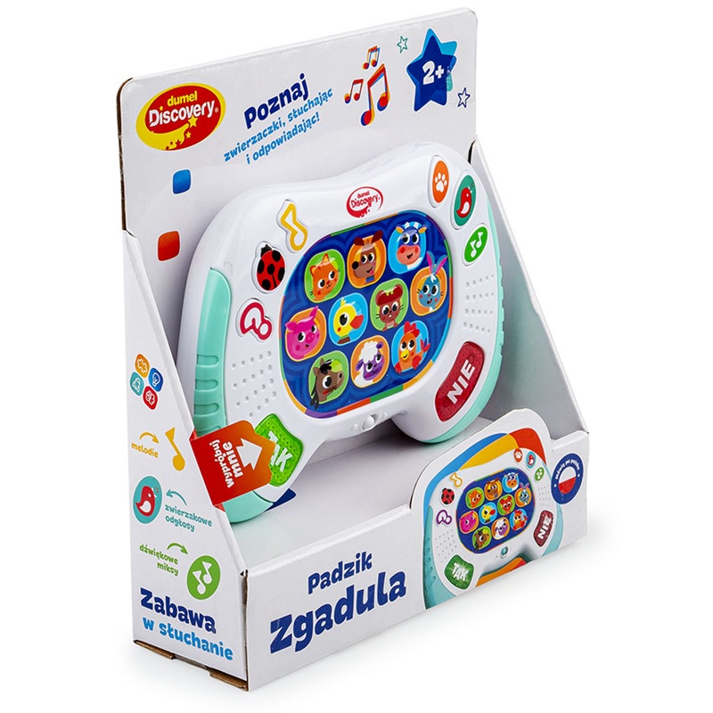 Pobaw się ze zwierzątkami w zgadywanki! Ten kompaktowy padzik wyposażony jest w kolorowe przyciski. Znajdziemy tu guziczki z podobiznami zwierzątek oraz przyciski aktywujące tryb zabawy: ciekawostki o zwierzątkach, dźwiękowe niespodzianki, takie jak zwierzęce odgłosy, dźwiękowe miksy czy wesołe melodie, a także quiz biedronki, działający na zasadzie gry „prawda czy fałsz”. Aby udzielić odpowiedzi na usłyszane pytanie, należy nacisnąć jeden z podświetlanych guziczków: TAK lub NIE. Zabawka wyposażona jest w praktyczny przełącznik ON/OFF, co umożliwia jej wyłączenie po zakończonej zabawy.