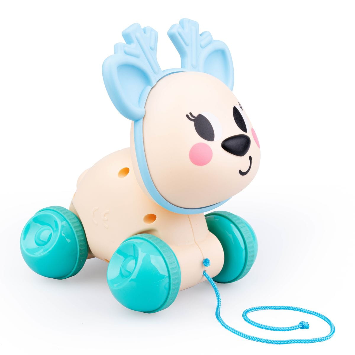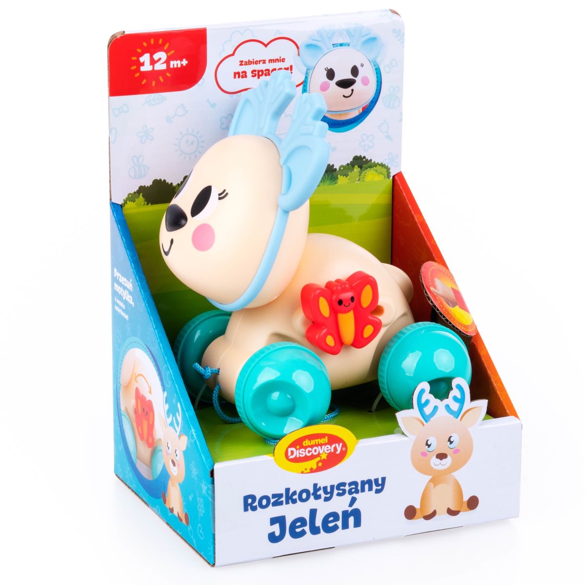 | Dumel Discovery Rozkołysany Jeleń Uroczy jelonek aż kołysze się do zabawy! Posiada sznureczek do prowadzenia i cztery kółeczka o nieregularnym kształcie, co zapewnia ciekawy efekt wizualny. Dodatkowo, można je rozpędzić, aby postawiony na podłodze zwierzak pojechał samodzielnie do przodu. Podczas jazdy, zabawka wesoło kręci główką. Na boku jelenia siedzi kolorowy motylek, który przy przesuwaniu wydaje terkoczący odgłos. Zabawka przeznaczona jest dla dzieci od 12 miesiąca życia. Cechy produktu: