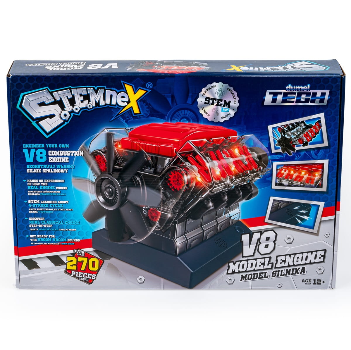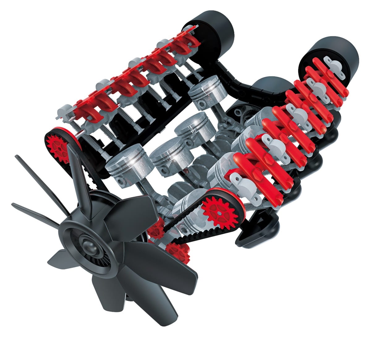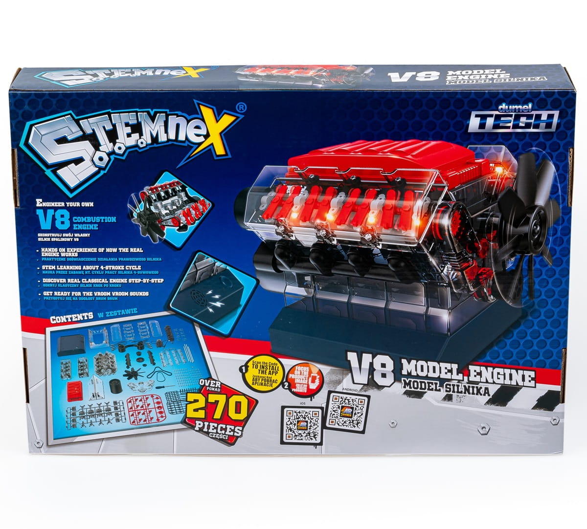 Dowiedz się jak działa silnik 4-suwowy i zbuduj go samodzielnie! Duży zestaw składa się z aż 270 elementów, które, odpowiednio ze sobą połączone, stworzą model silnika V8. Kiedy umieścisz w nim baterie (niezawarte w zestawie), silnik uruchomi się, wydając przy tym realistyczne odgłosy! Obserwuj jego pracę i ucz się poprzez zabawę.