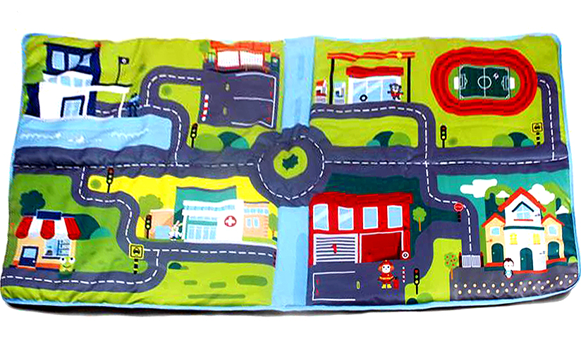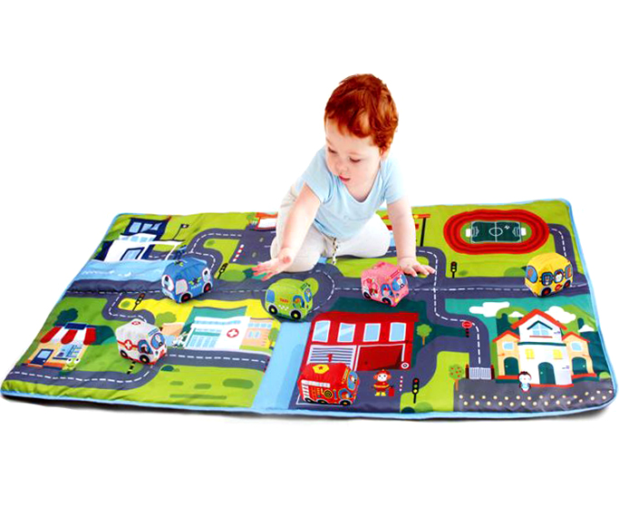 Dywanik jest uzupełniony o 6 miękkich poduszkowych samochoduików - strażacy, policja, autobus, ....
