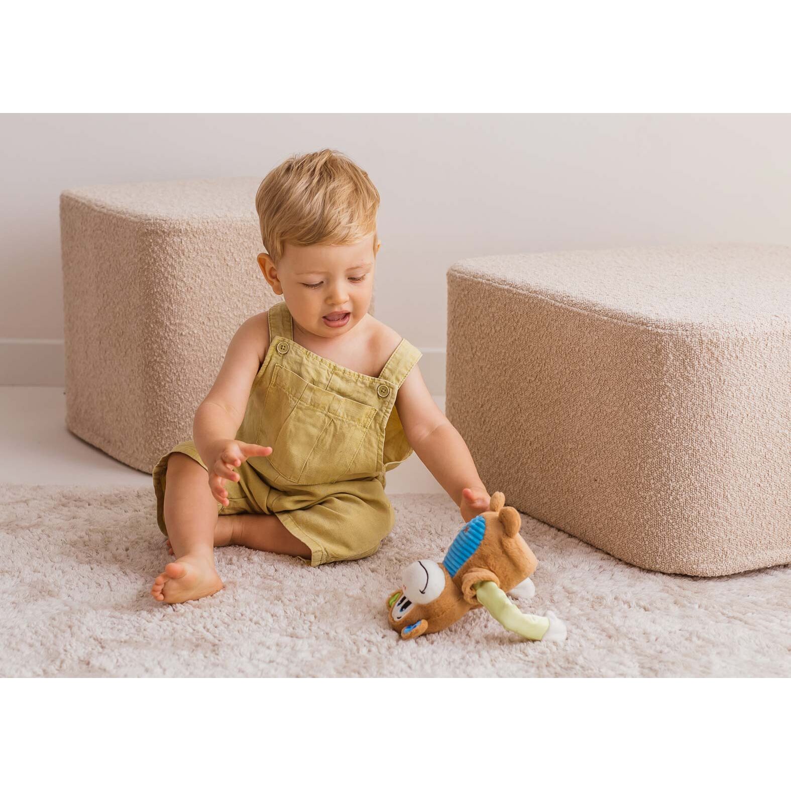 Hej, szkrabie, zabawny małpiszon porusza się do przodu na swych obrotowych ramionach, czy uda ci się go złapać? Małpka przemieszcza się zwinnie, zachęcając najmłodszych do ruchu. Zwierzak został wykonany z materiałów o zróżnicowanych fakturach, a jego poruszaniu się towarzyszą dwie wesołe melodie, które uprzyjemnią zabawę. Produkt przeznaczony jest dla dzieci od 18 miesiąca życia.