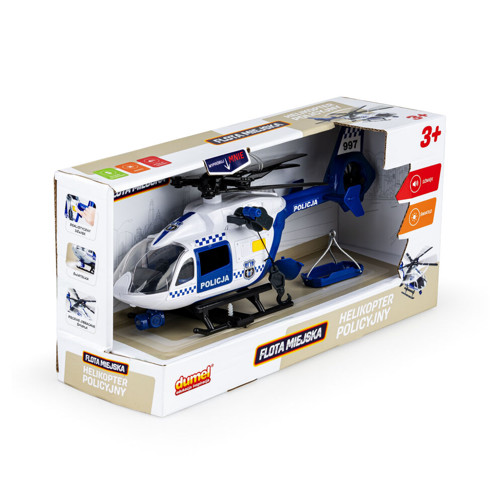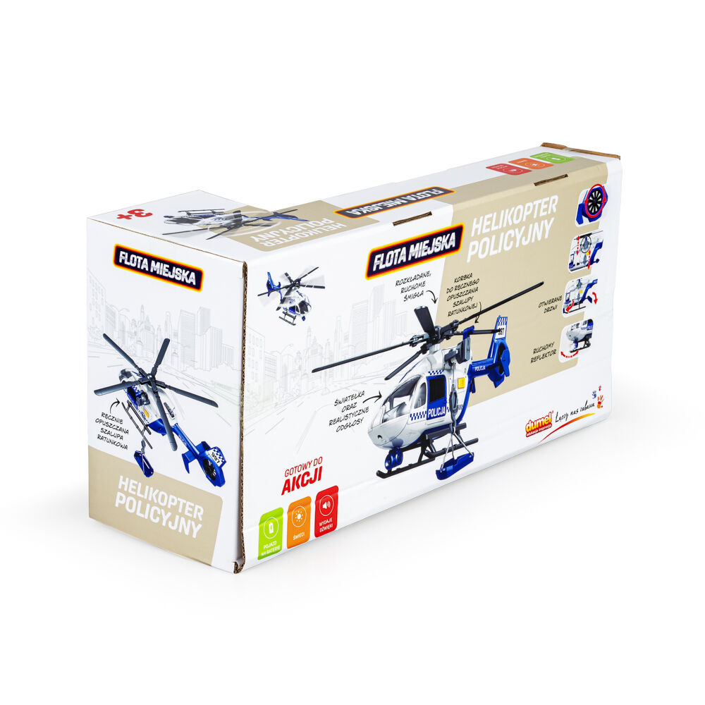 Rozwijaj wyobraźnię wraz z helikopterem policyjnym! Pojazd wyposażony jest w szereg funkcji, które zainspirują do wesołej zabawy i odgrywania scenek z tym realistycznym helikopterem w roli głównej. Posiada on ręcznie obracane śmigła, a także szalupę ratunkową z korbką do ręcznego opuszczania. Dodatkowo, znajdziemy tu ręcznie otwierane drzwi, ruchomy reflektor i przyciski aktywujące dźwięki oraz światełka.