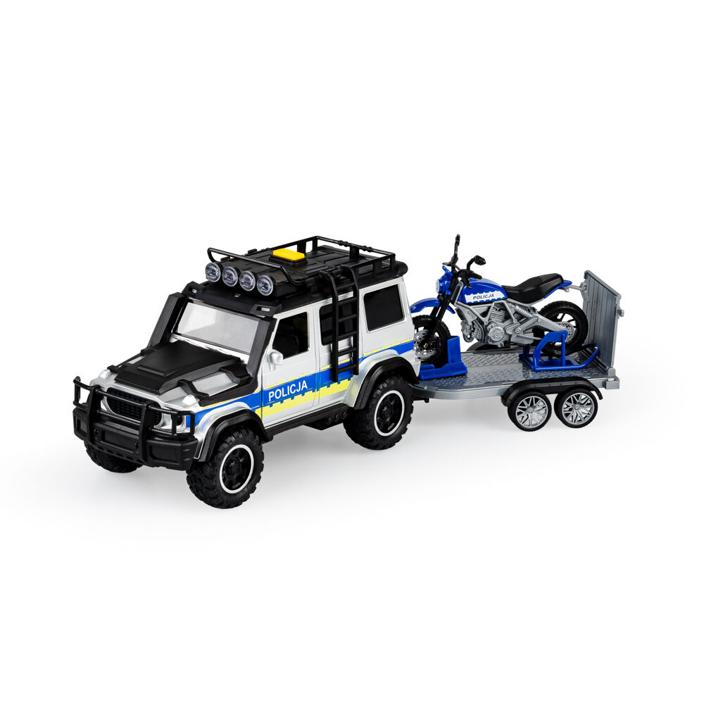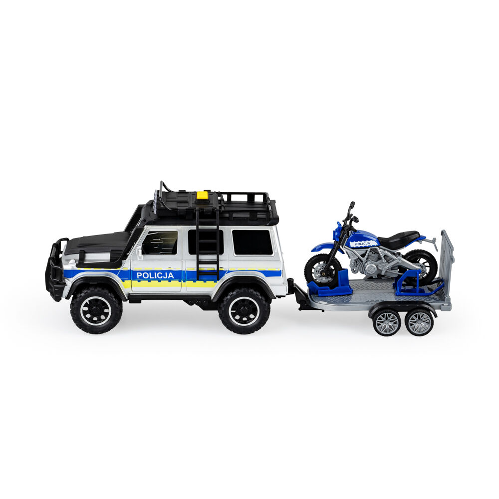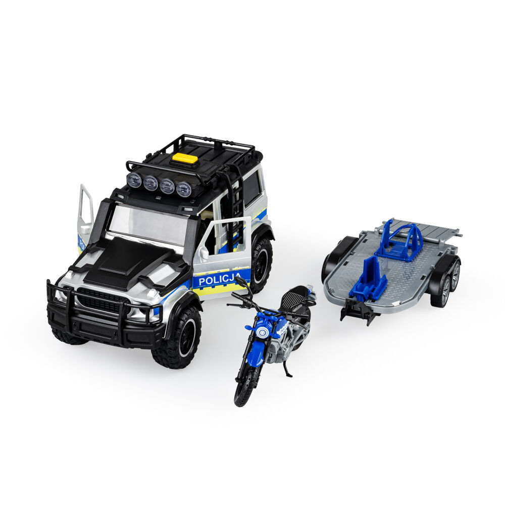 Z zestawem policyjnych pojazdów zabawa w patrolowanie będzie prawdziwą przyjemnością! Znajdziemy tu SUV, zasilany bateriami, który posiada odpinaną drabinę i przyczepkę, a na dachu specjalny przycisk, uruchamiający realistyczne dźwięki i światełka. Drugi z pojazdów, motocykl, posiada na przyczepce wygodne miejsce, dzięki czemu można go na niej swobodnie przewozić. Sam motocykl wyposażony został w ręcznie obracaną kierownicę i opuszczaną stopkę, co upodabnia go do prawdziwego jednośladu.