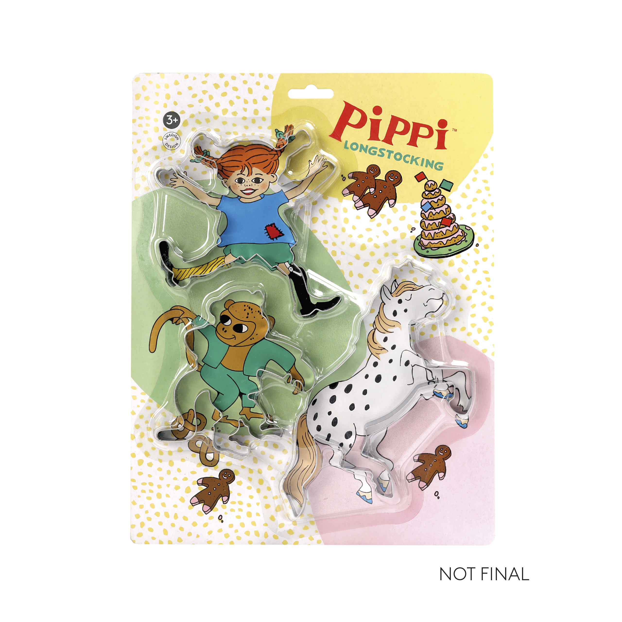 Zestaw zawiera 3 foremki do pieczenia ciastek o kształtach Pippi Langstrumpf, jej konika Alfonso i małpki Pana Nilssona. Foremki zostały zaprojektowane w Szwecji i starannie wykonane z odwzorowaniem oryginalnych ilustracji z książek o perypetiach piegowatej superbohaterki.