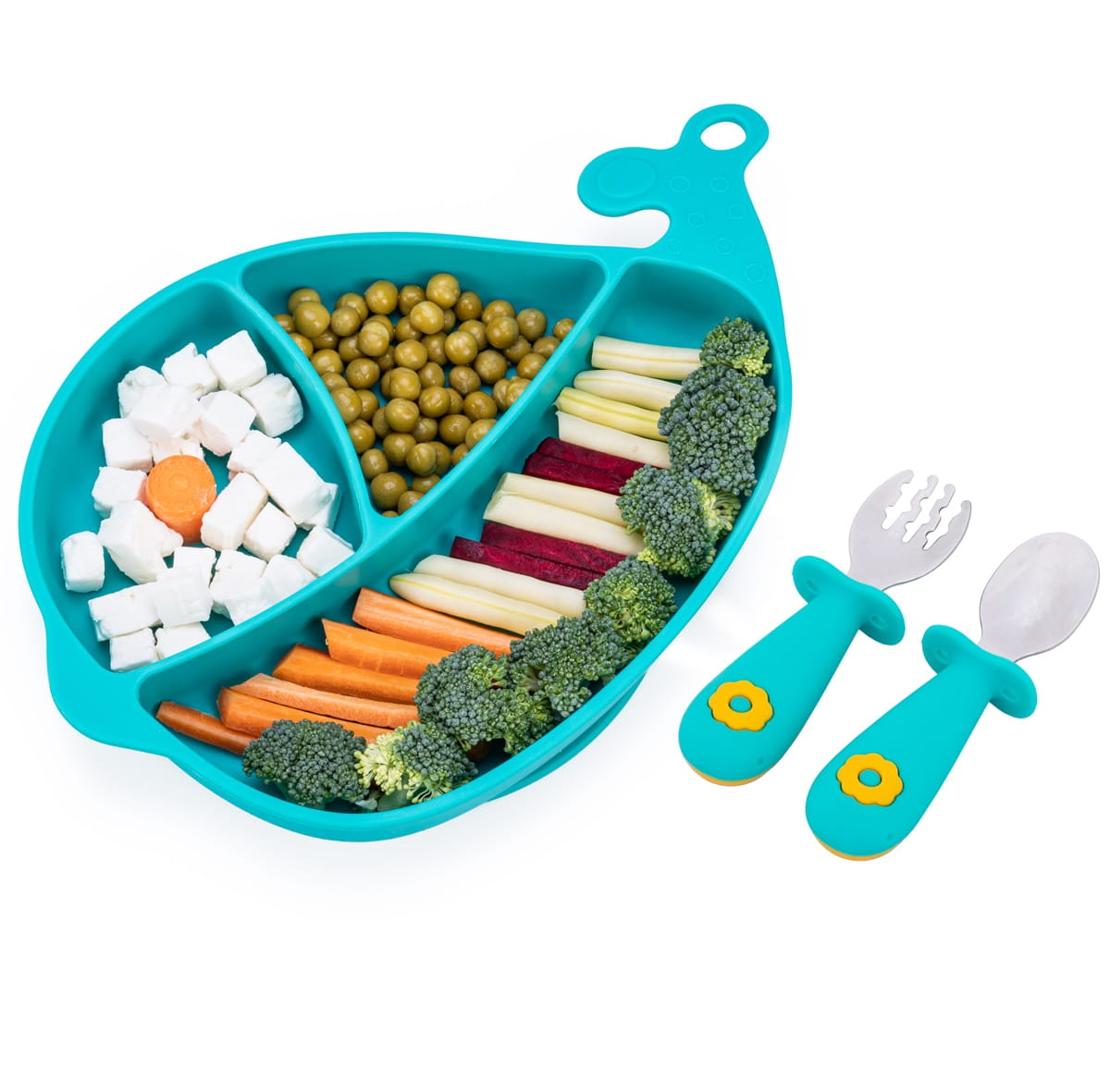 Praktyczny zestaw, który umili posiłki i zachęci najmłodszych do samodzielnego jedzenia! W jego skład wchodzi silikonowy talerzyk w kształcie wieloryba i komplet sztućców (widelec oraz łyżka), wykonanych ze stali nierdzewnej oraz silikonu. Każda z przegródek talerzyka ma inną pojemność, co pozwala na odpowiednie rozmieszczenie poszczególnych elementów posiłku. W postawie talerzyka znajduje się silikonowa przyssawka, która zapobiega przesuwaniu się talerza, ułatwiając tym samym maluchowi spożywanie posiłku. Sztućce wyposażone są w silikonowe uchwyty, które zapobiegają niekontrolowanemu wyślizgiwaniu się łyżki czy widelca z rączki. Zestaw dostępny jest również w kolorze szarym.