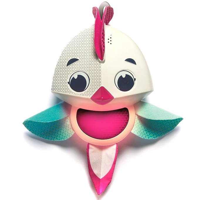 Zabawka Ptaszek ze światełkiem i muzyką oraz funkcją nagrywania. Zabawka może zostać odczepiona i przymocowana np. do wózka, fotelika czy łóżeczka.