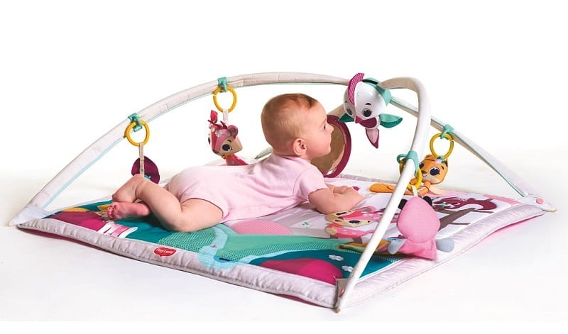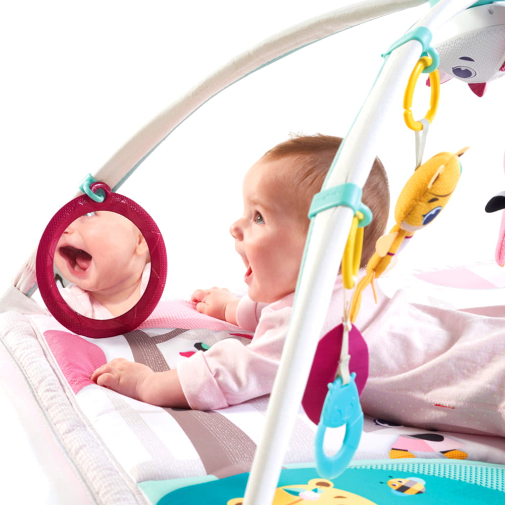 Angażujące lusterko oraz inne funkcje maty pomogą dziecku wydłużyć czas spędzony na brzuszku, który przyczyni się do rozwoju ruchów całego ciała.