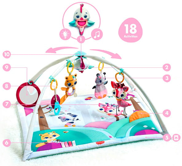 • zawiera liczne urocze zabawki, aktywujące rozwój Twojej pociechy, bezpieczne lusterko, oraz elementy świecące i grające