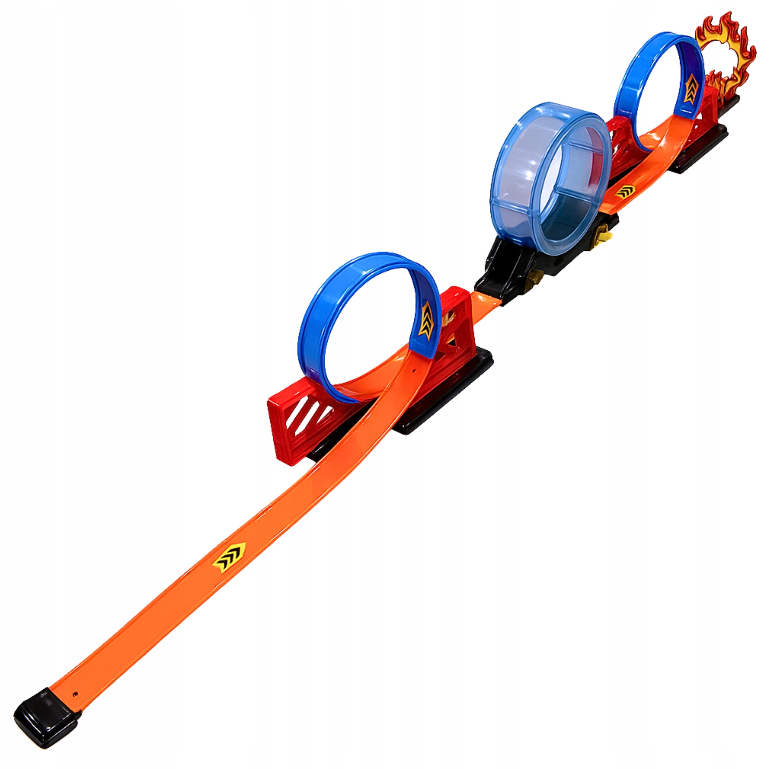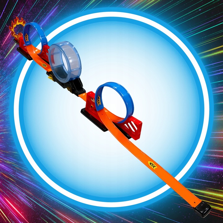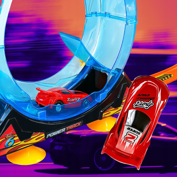 - Dołączone autko z napędem na tylne koła — wystarczy pociągnąć go do tyłu, aby rozpędził się i przejechał cały tor, w tym trzy spektakularne pętle.