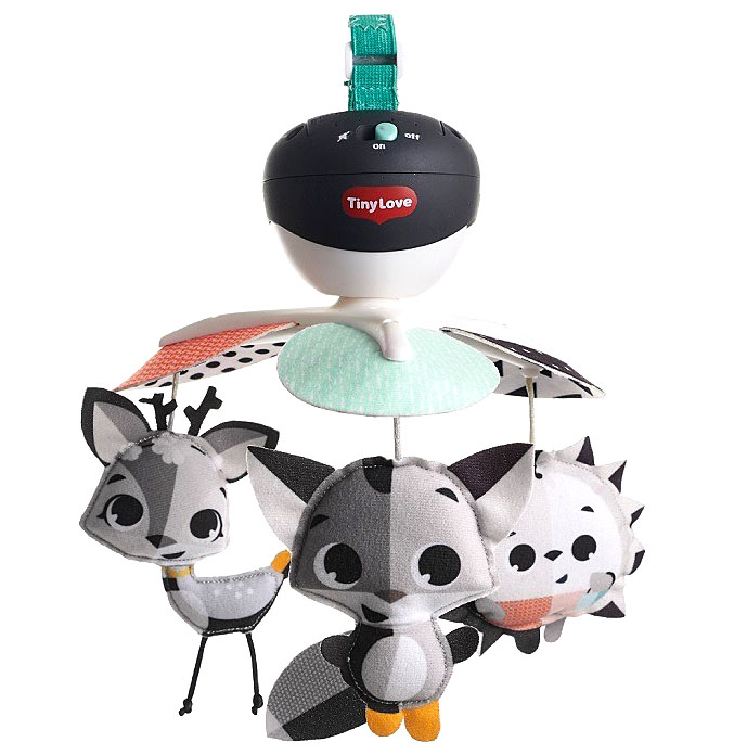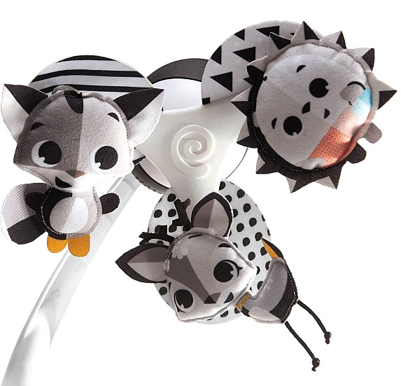 - Zmysły - unikatowy czarno-biały design, duże oczy uśmiechniętych postaci łącznie z delikatną muzyką oferują stymulację wzroku i słuchu dziecka, wspomagając ich rozwój.