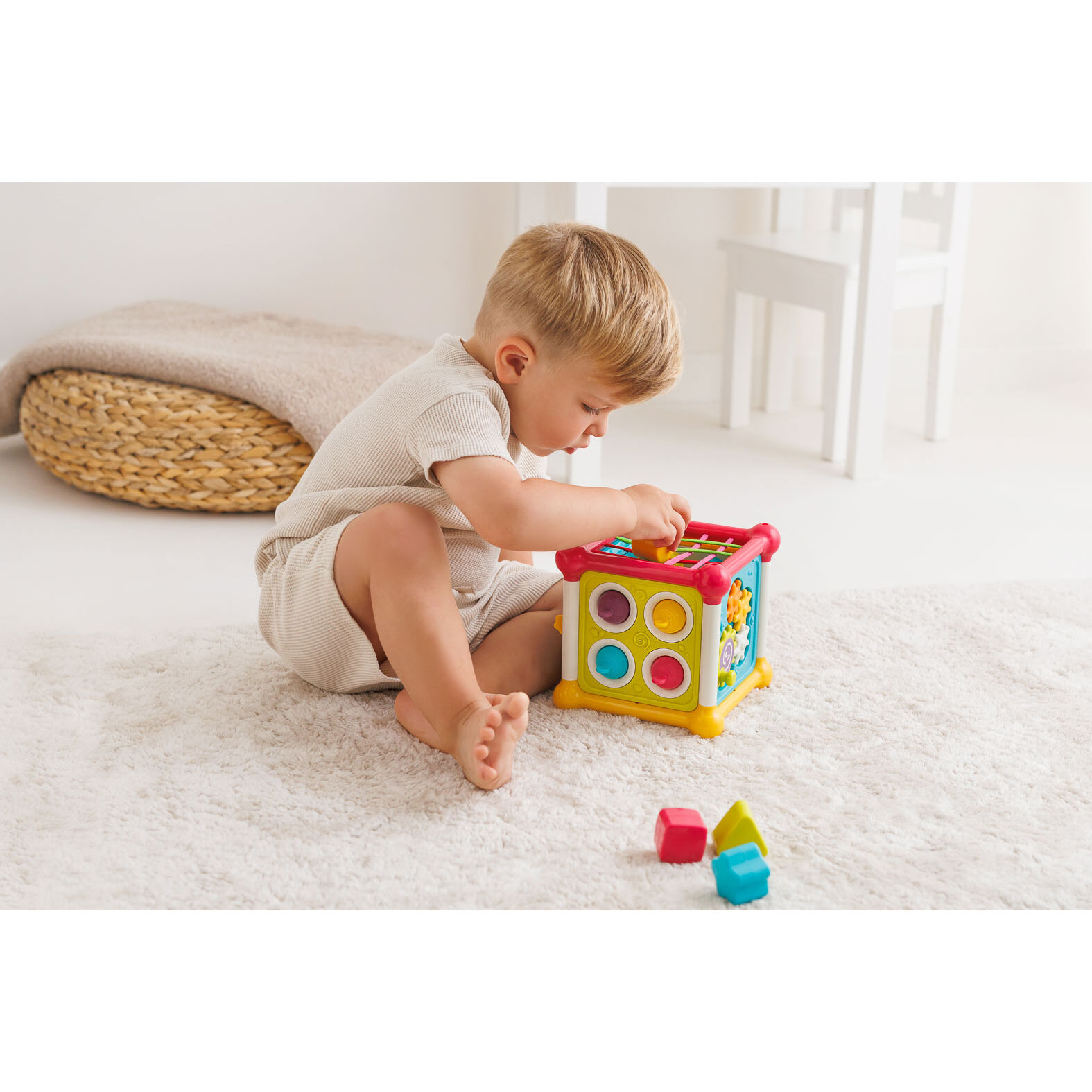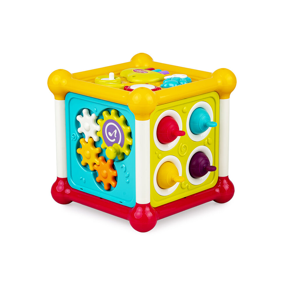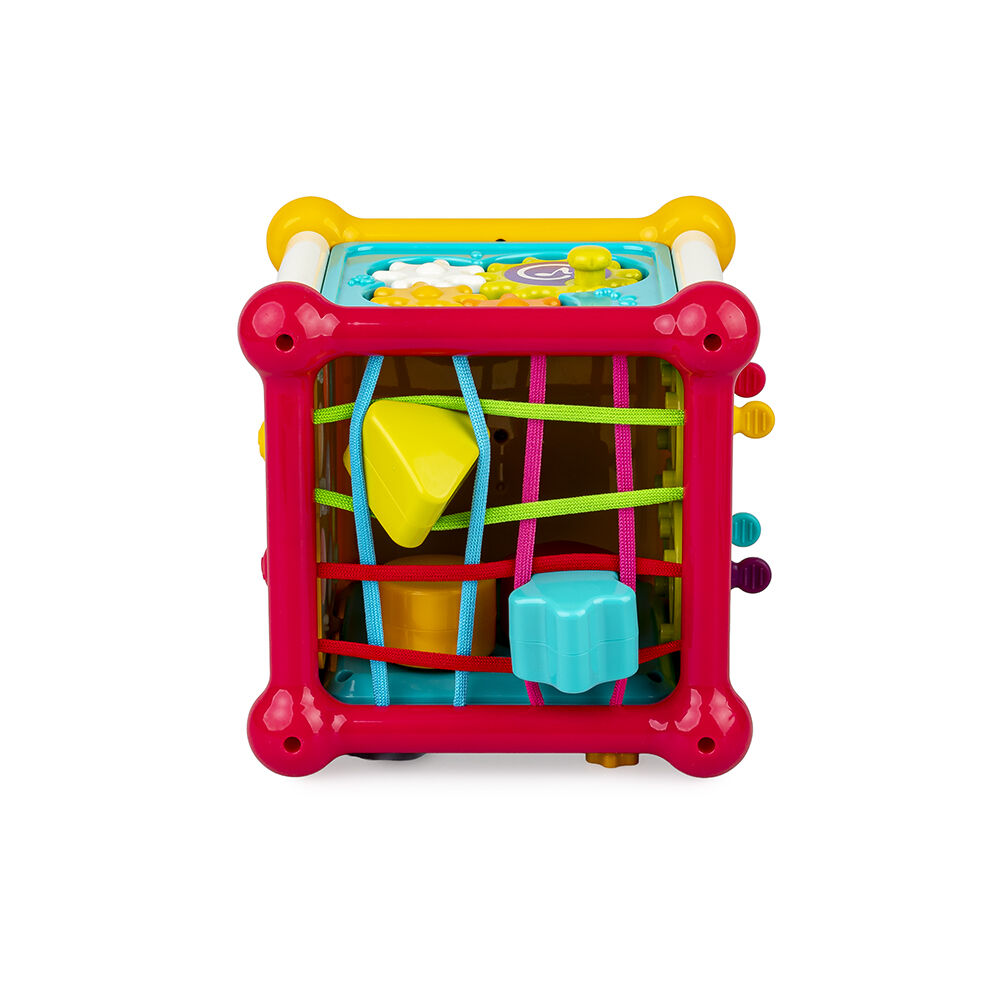 Kolorowa kostka zabawi na wiele różnych sposobów, dostarczając maluszkom okazji do ćwiczenia rączek! Każda ze ścianek to inna aktywność. Znajdziemy tu trybiki do kręcenia, żaluzje do odsłaniania, zasłonki do rozsuwania, elementy do wciskania i wyciągania, sznureczki do przekładania klocków, dołączonych do zestawu, oraz ściankę muzyczną, na której znajdują się kształty instrumentów muzycznych, a umieszczone w nich przyciski uruchamiają dźwięki i melodie. W kostce kryje się też niespodzianka, w postaci ruchomej ścianki, której odchylenie umożliwia wygodne wyjmowanie włożonych wcześniej do kostki klocków.