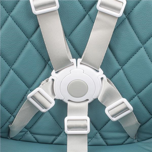 - Pięciopunktowy pas i podnóżek pod tacką chronią dziecko przed wypadnięciem