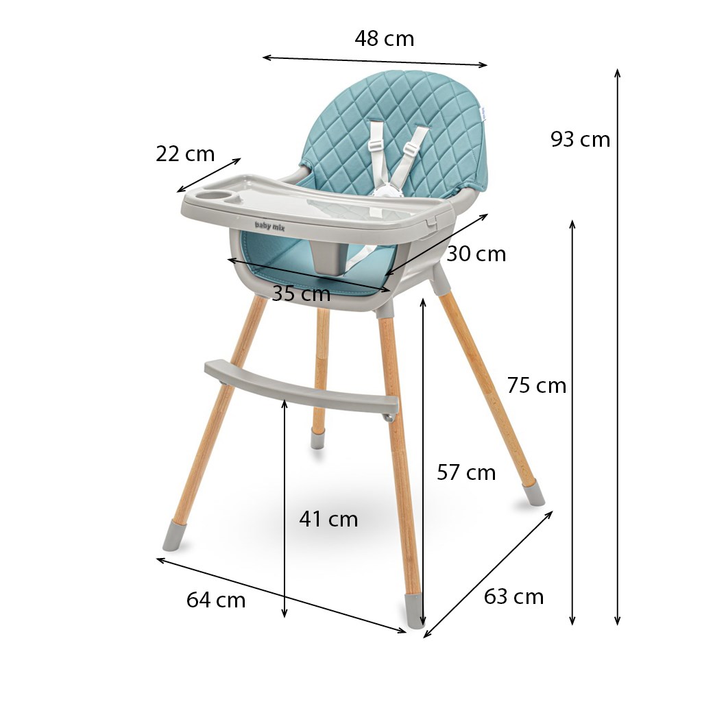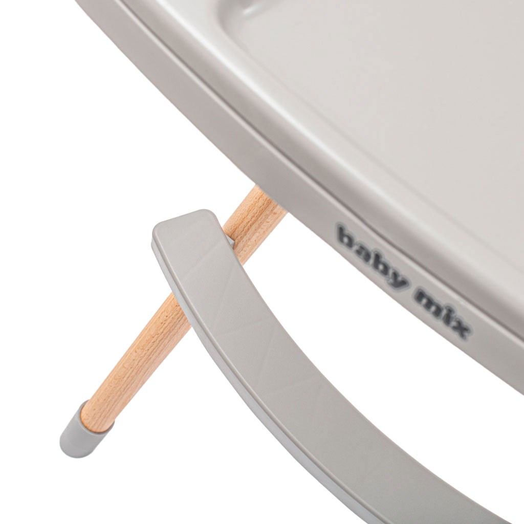 Krzesełko Baby Mix posiada wszystkie funkcje, które ułatwiają codzienne karmienie: regulowaną podwójną tackę, 5-punktowe pasy bezpieczeństwa, zdejmowaną tapicerkę z ekoskóry, podnóżek, materiałowy kosz, antypoślizgowe nóżki. Krzesełko można łatwo przekształcić w niski taboret, zdejmując dolną część nóg. Krzesełko Baby Mix jest odpowiednie dla dzieci w wieku 6-36 miesięcy.