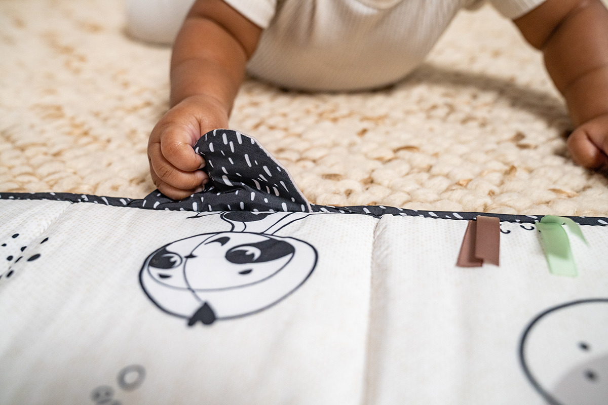 - Stymuluje zmysły dziecka dzięki zabawnym teksturom, kontrastującym kształtom i kolorowym postaciom, które zapewniają niezwykle ważną stymulację zmysłu wzroku i dotyku.