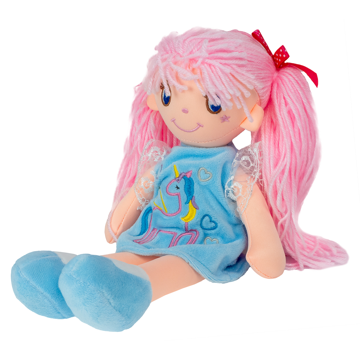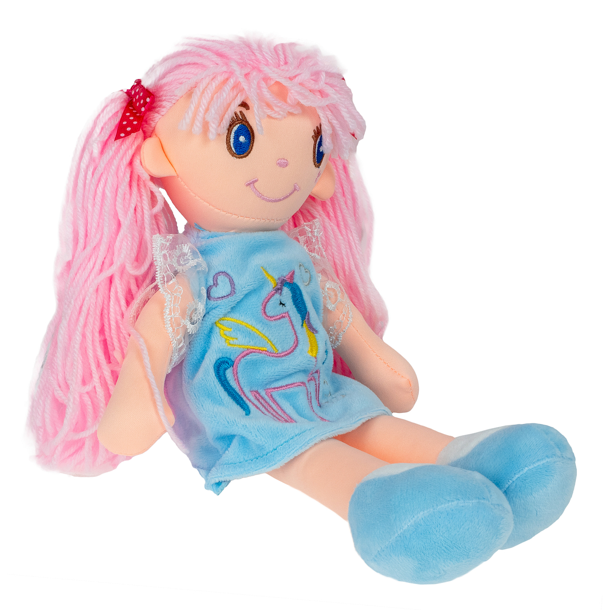 Urocza lalka, wykonana z materiału przyjemnego w dotyku, doskonała jako przytulanka.