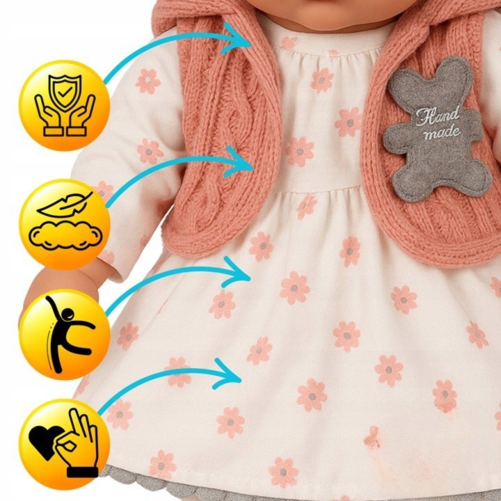 - Wykonana z miękkiego materiałowego brzuszka i gumowych elementów, wygląda jak prawdziwe niemowlę.