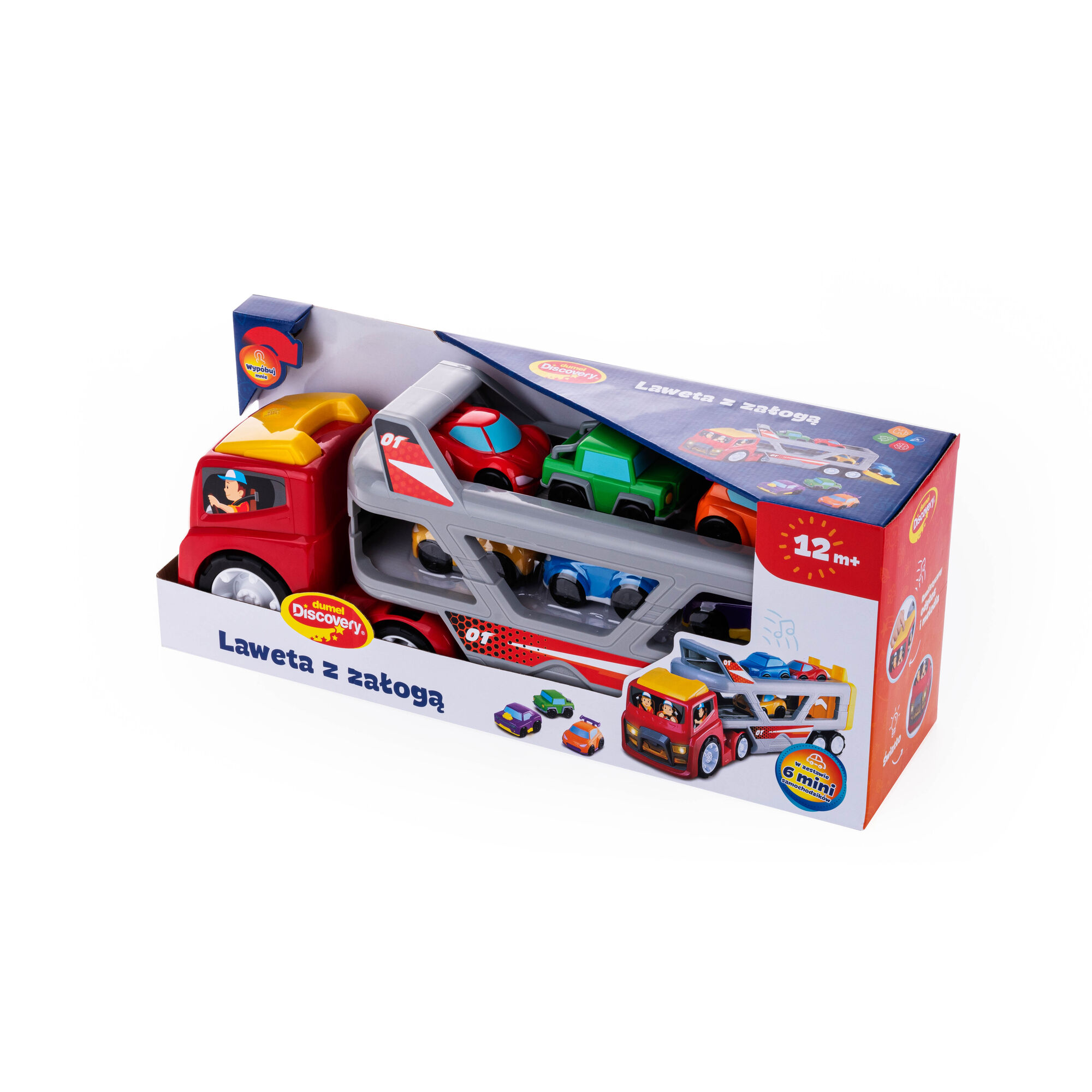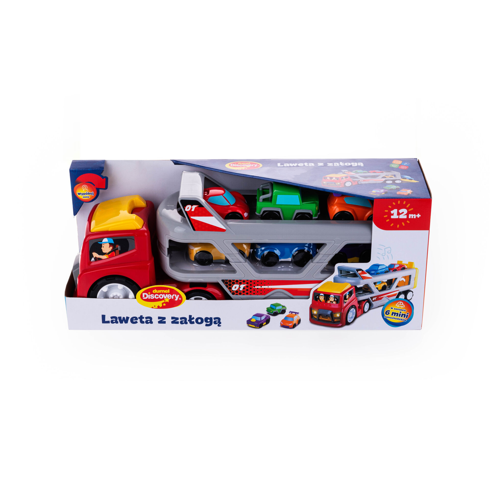 Przewoź samochodziki i ciesz się realistycznymi, moto-odgłosami! W zestawie znajduje się duża laweta ze światełkami, dźwiękami i melodią oraz 6 małych samochodzików, które mieszczą się idealnie na dwóch poziomach lawety. Każdy z samochodów ma inny kształt i kolor, więc bez trudu je odróżnisz. Laweta została wyposażona w rampę z opuszczanym wjazdem, co ułatwia samochodzikom wjazd „na pokład” i zajęcie miejsca na jednym z poziomów.