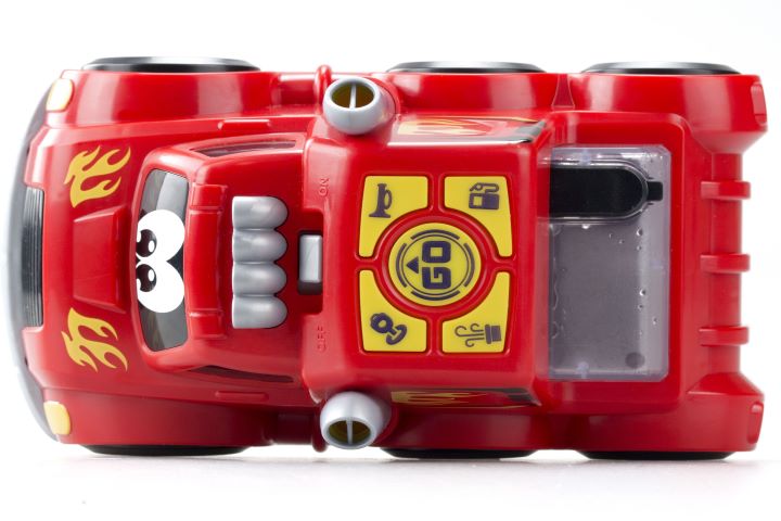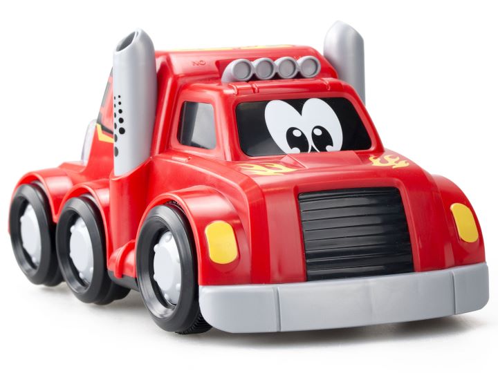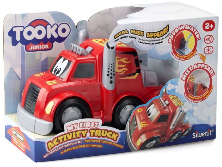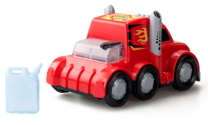 Odkryj moc drzemiącą w sześciu kółkach! Ta urocza ciężarówka zachwyci malucha prawdziwym dymem, wydobywającym się z kominów. W zestawie znajduje się specjalny zbiornik, w który należy zassać wodę, a następnie za jego pomocą napełnić przezroczysty pojemnik, znajdujący się w tylnej części pojazdu. Na dachu ciężarówki znajduje się przełącznik ON-OFF oraz 5 żółtych przycisków. Dwa z nich odpowiadają za uruchamianie realistycznych odgłosów (trąbka i dystrybutor), dwa za aktywowanie dymu (kluczyk i komin), a największy przycisk z napisem GO uruchamia jazdę do przodu, której także towarzyszy dym. Ciężarówka wyposażona jest w niebieskie światełko, umieszczone w tylnej części pojazdu. W trakcie zabawy podświetla ono pojemnik z wodą, co tworzy ciekawy efekt wizualny.