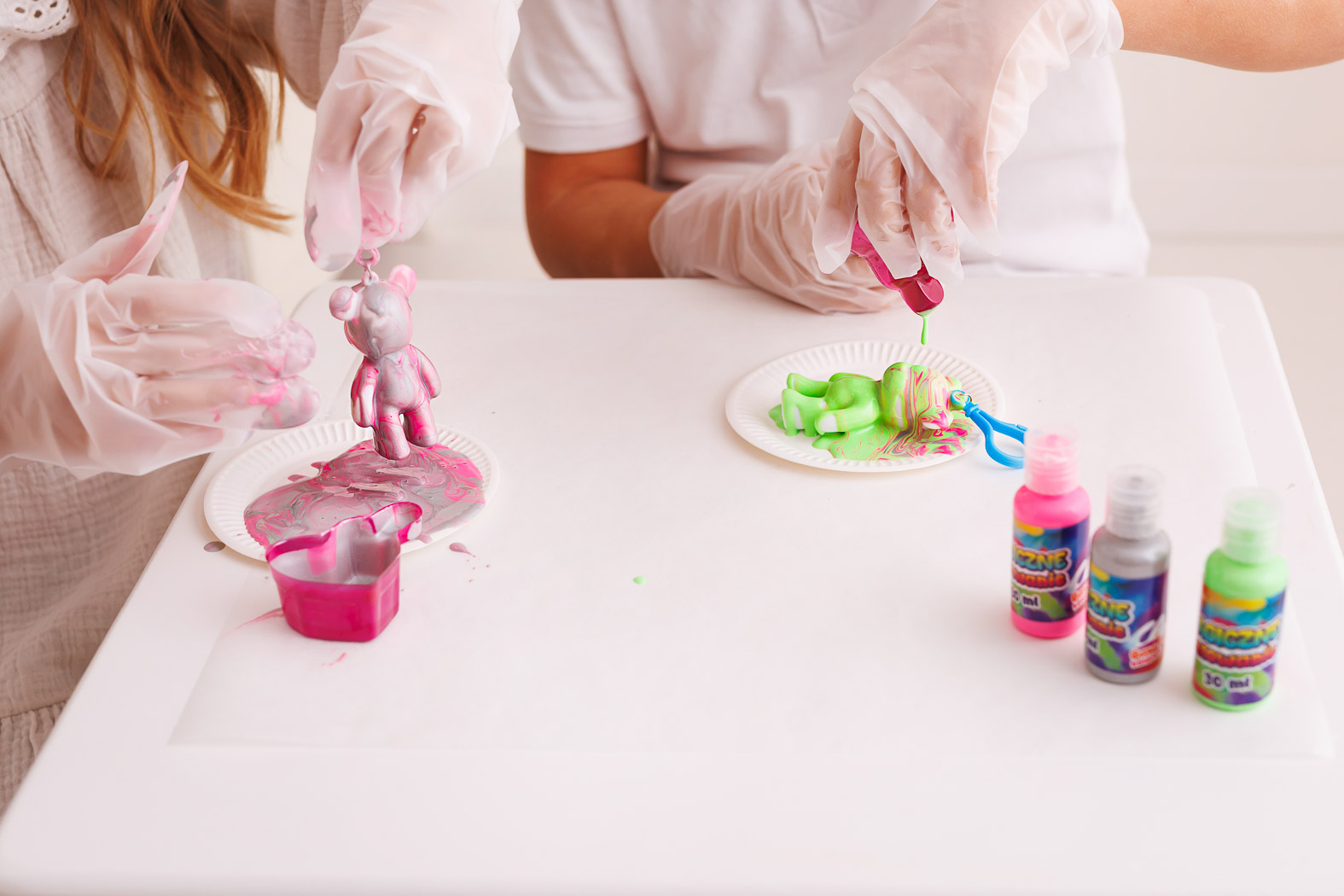 Zabawa w malowanie to świetna okazja do rozwijania wyobraźni! Wciel się w rolę prawdziwego artysty, ozdabiając misiowe breloczki. Wszystko co trzeba zrobić, aby przystąpić do zabawy, to wlać do kubeczka farbki w dowolnej kolejności, nie mieszając ich ze sobą. Podczas wlewania jednej farby do drugiej, w naturalny sposób połączą się one ze sobą, zachowując swoje kolory i tworząc piękne przejścia barw. Tak przygotowaną zawartością kubeczka oblej breloczek, zwracając uwagę na to, by farby dokładnie pokryły kolorem całego misia. Czynności te powtórz w przypadku drugiej ozdoby. Pomalowane misie pozostaw w bezpiecznym miejscu do całkowitego wyschnięcia, a gdy to nastąpi, przyczep zabawki w wybranym przez siebie miejscu. Taka unikatowa ozdoba będzie też świetnym prezentem dla ulubionej koleżanki lub kolegi.
