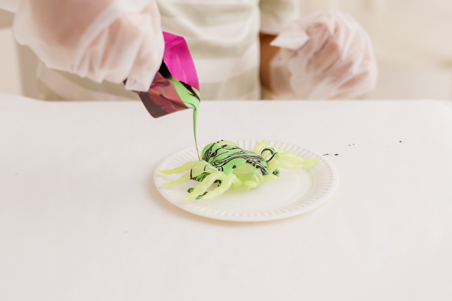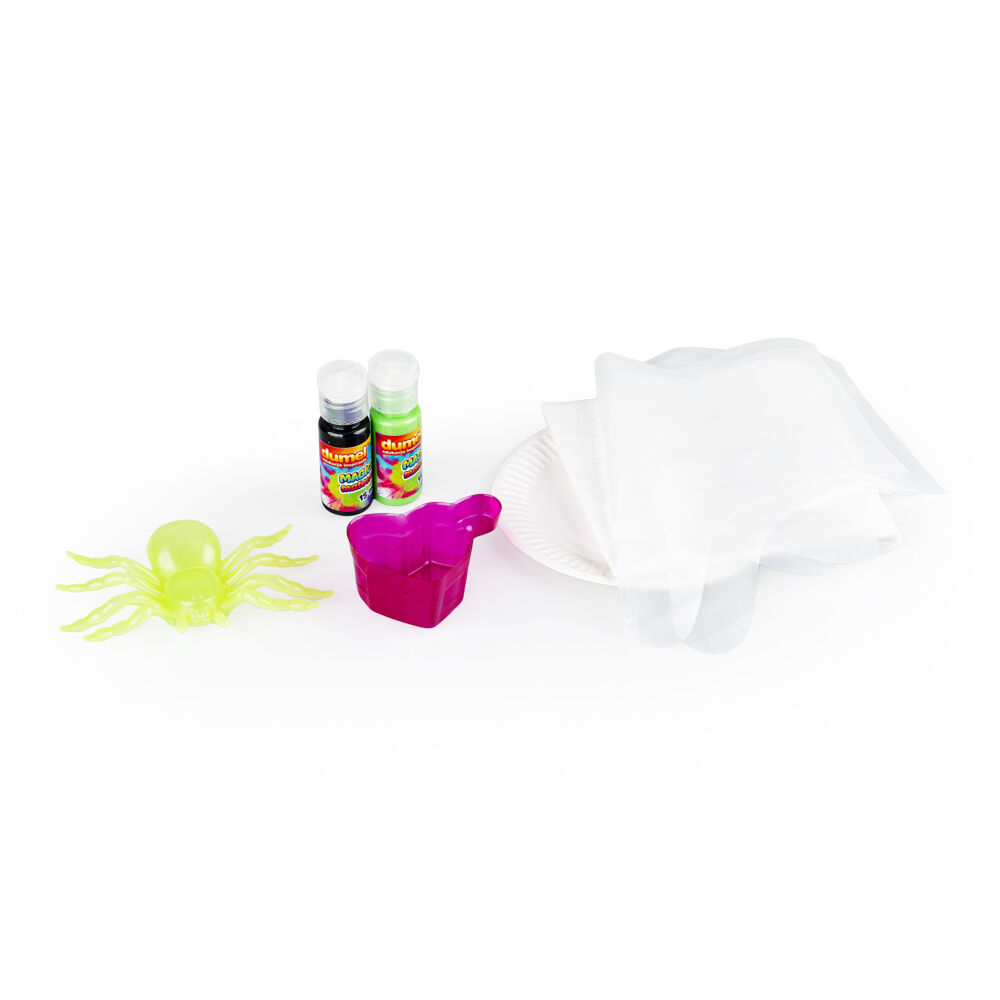 - W zestawie: 1 x forma pająka, 1 x kubeczek do odmierzania, 1 x papierowy talerzyk, 1 x wodoodporna mata, 1 x para foliowych rękawiczek, 2 x farbka 15 ml