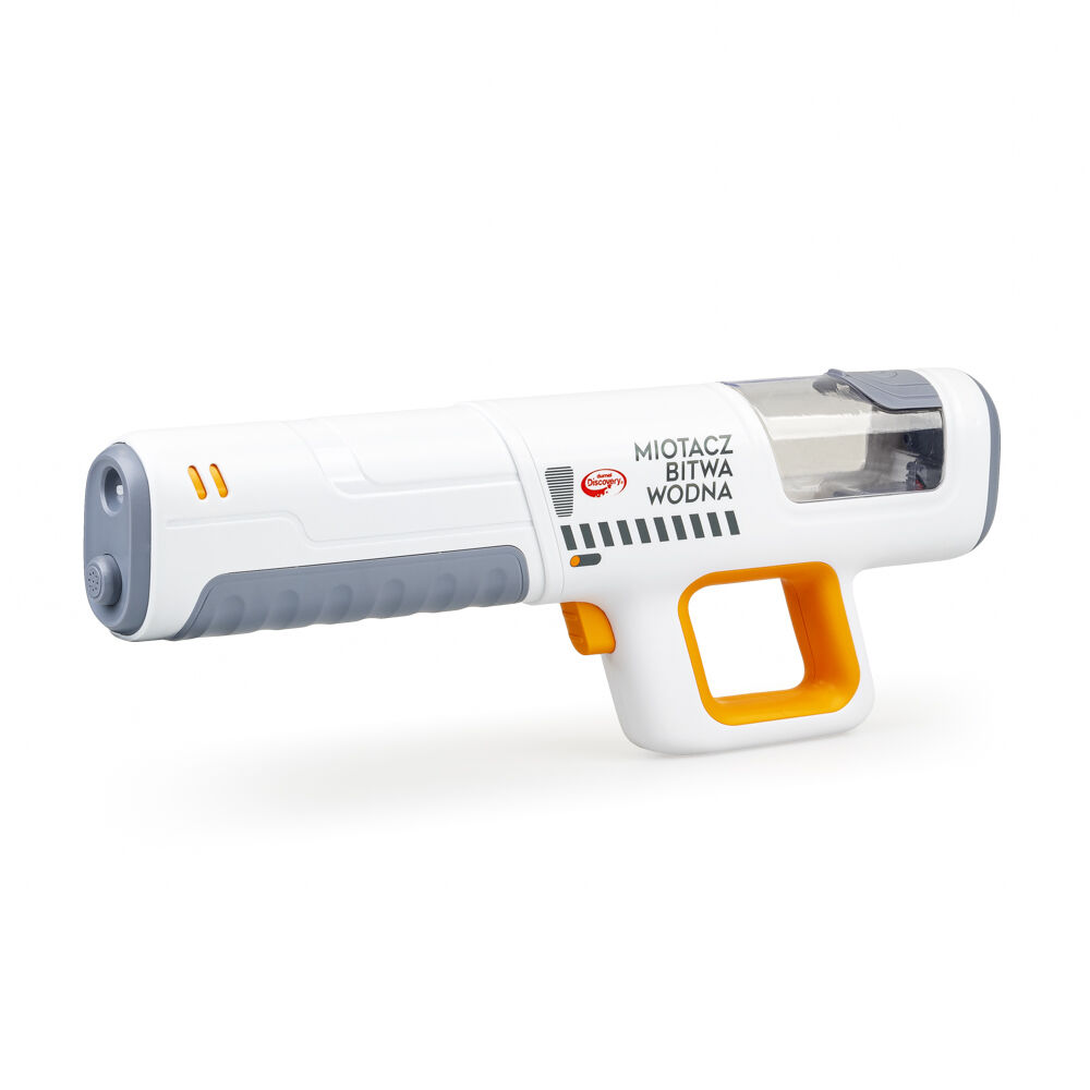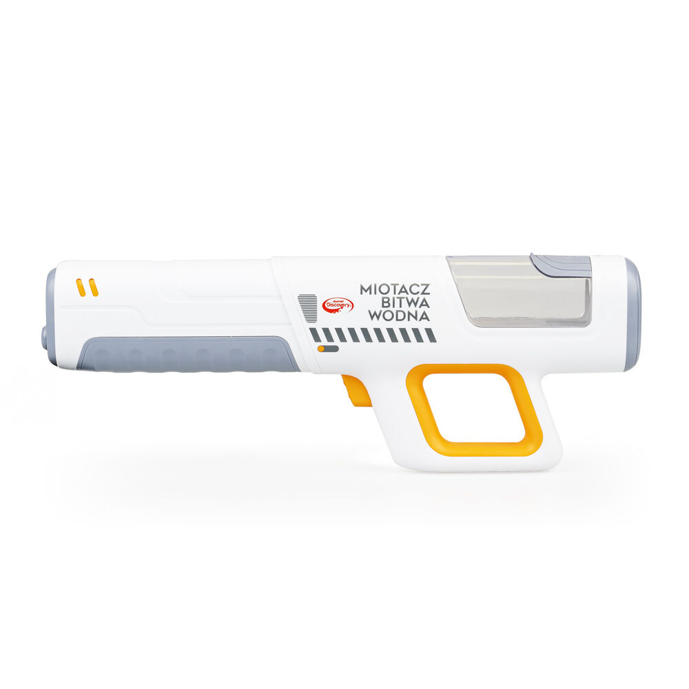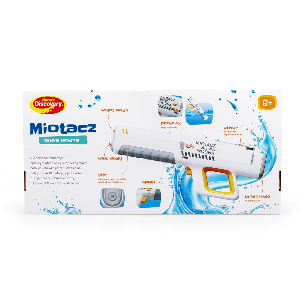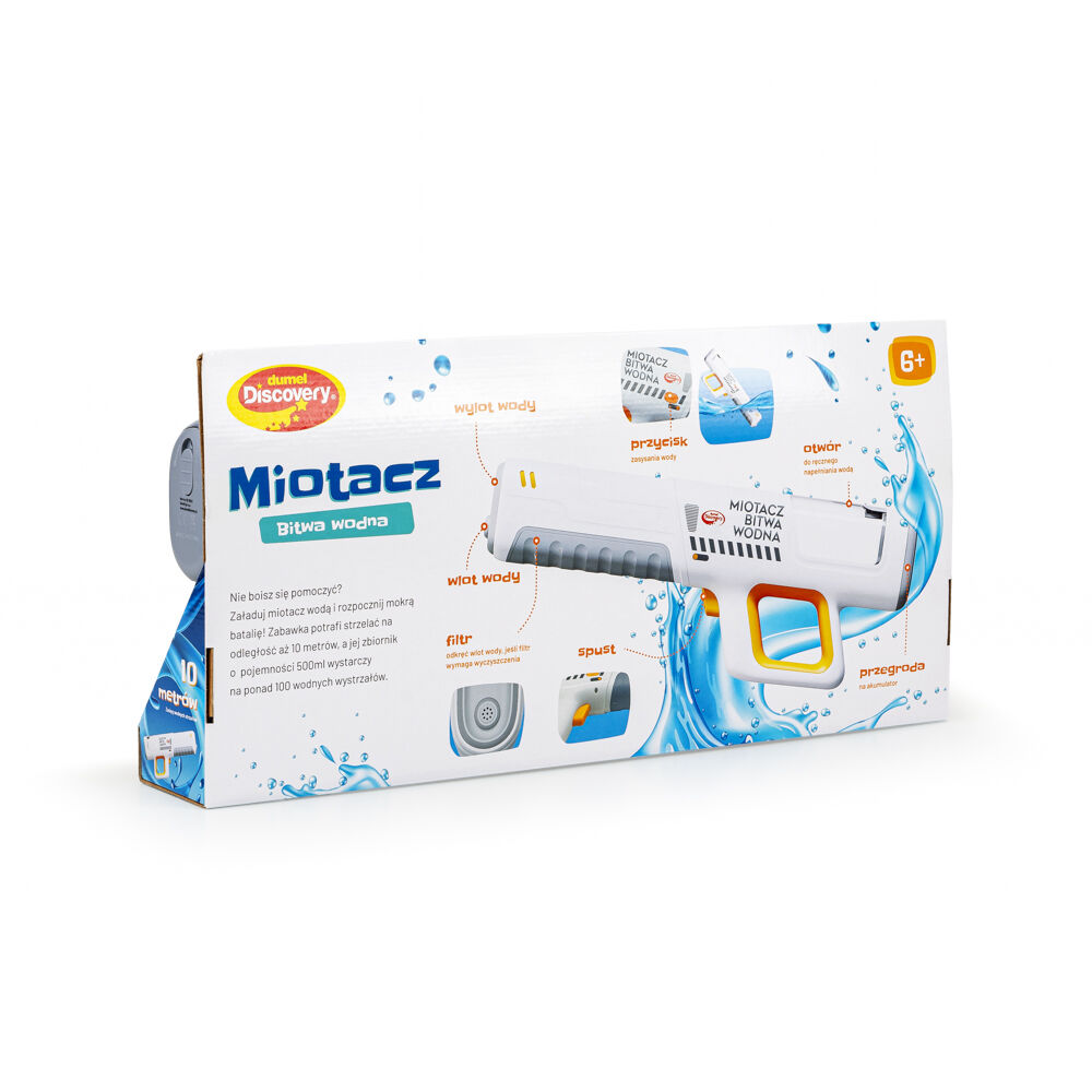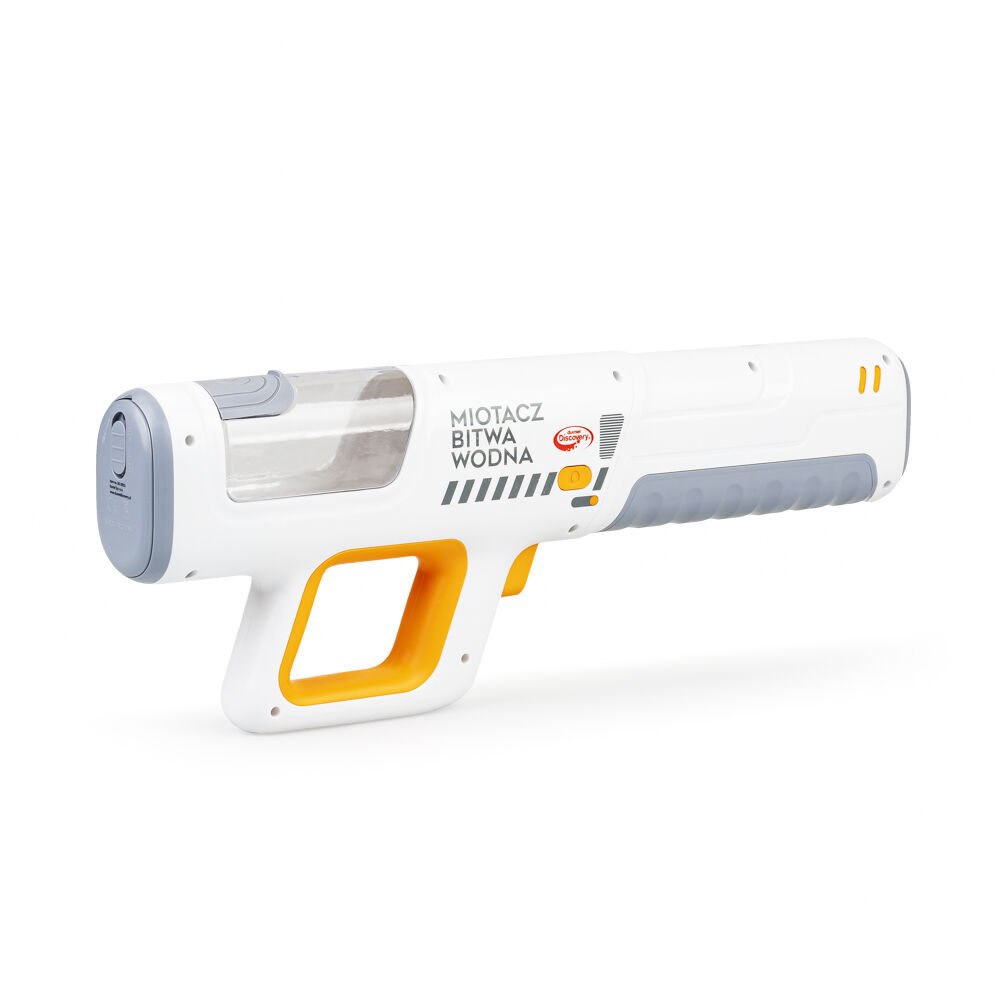 Misja: bitwa wodna! Ten imponujący miotacz wody wyposażony został w zbiorniczek, mieszczący pół litra wody, która to ilość wystarczy na oddanie około stu wodnych strzałów! Miotacz posiada dwie opcje napełniania wodą, poprzez ręczne nalanie wody we właściwy otwór, a także poprzez automatyczne zassanie wody lufą miotacza (tę funkcję uruchamia specjalny przycisk z prawej strony zabawki). Wyrzutnia posiada imponujący zasięg działania, gdyż tryska ona wodą na odległość aż do 10 metrów!