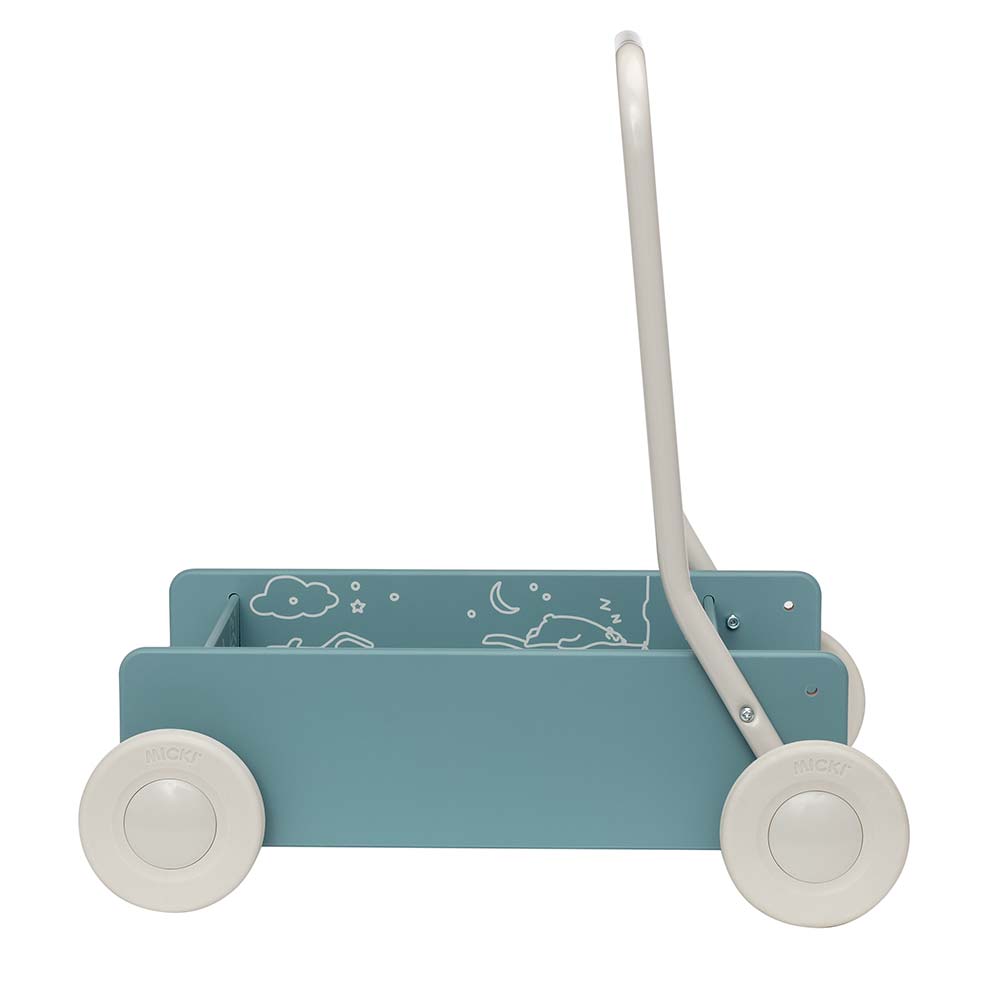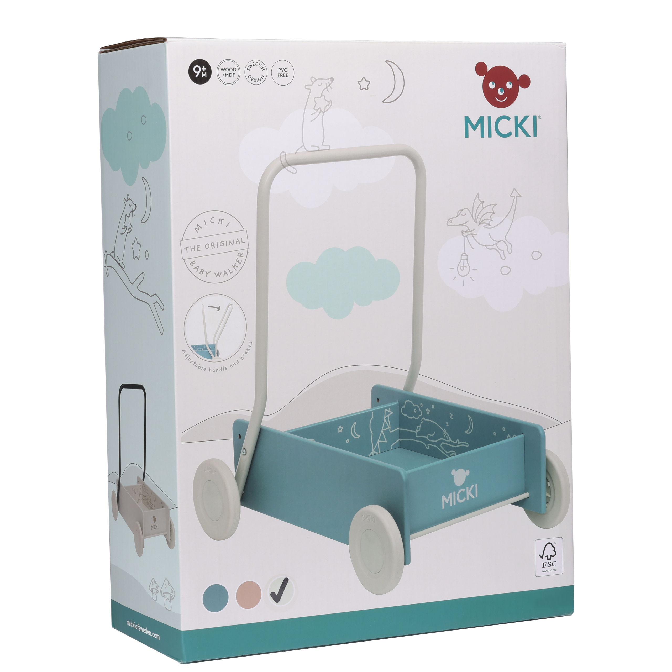 Dziecko podczas nauki chodzenia ma stabilne wsparcie, a gdy już opanuje nową umiejętność może zabrać swojego ulubionego misia na spacer w wózku lub przewozić klocki. Klasyczny chodzik Micki jest ozdobiony inspirującymi ilustracjami, dzięki czemu stanowi nie tylko narzędzie wspierające rozwój ruchowy, ale jest także kreatywną zabawką, która kieruje malucha w podróż pełną wyobraźni.