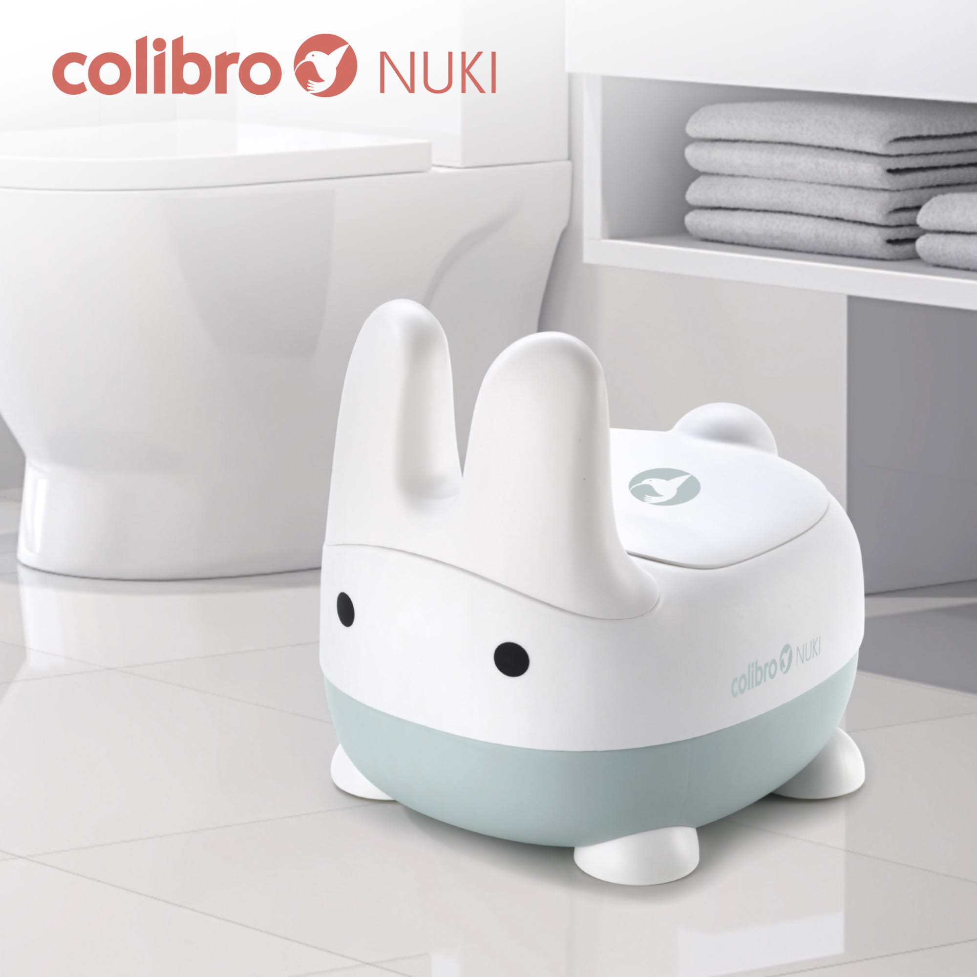 NUKI to imię naszego króliczka. Wybierz jeden z trzech pastelowych kolorów i wspólnie z króliczkiem zacznijcie naukę siadania na nocniku.