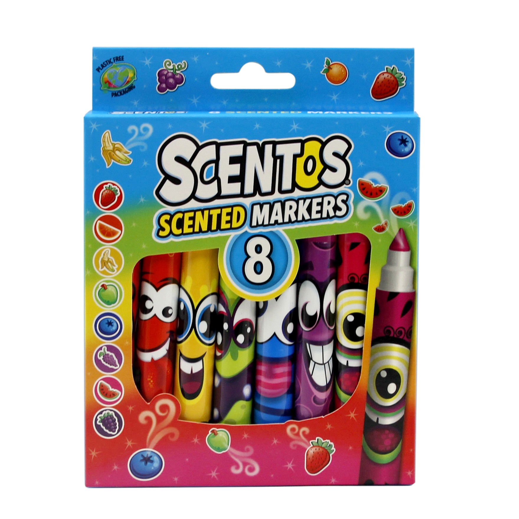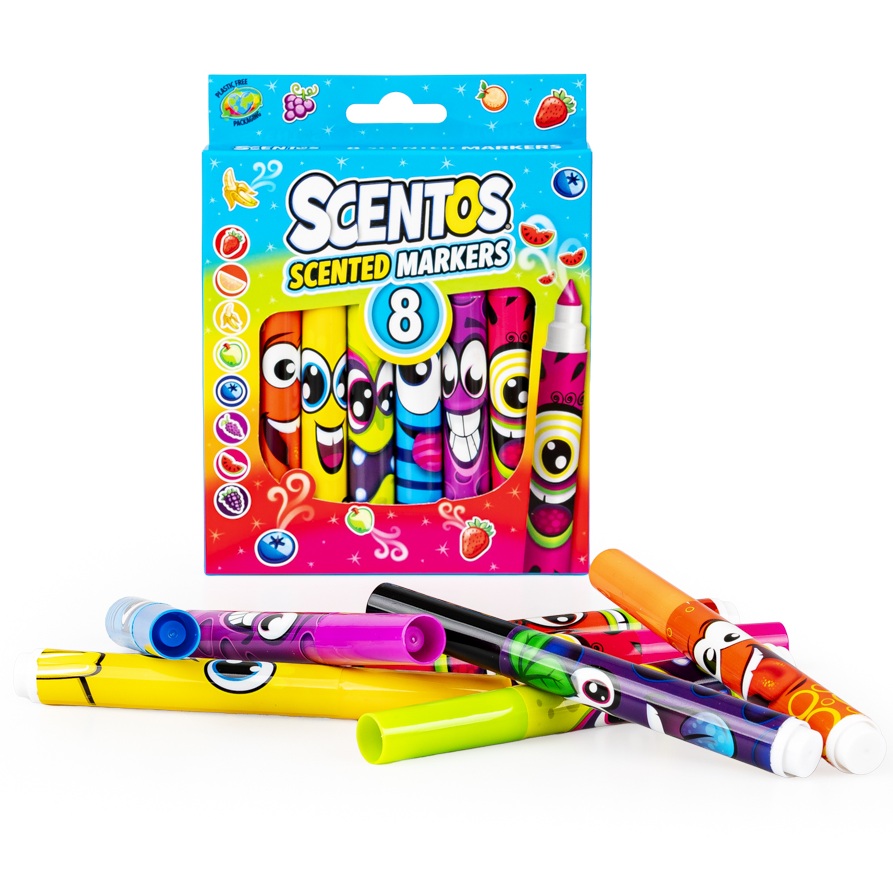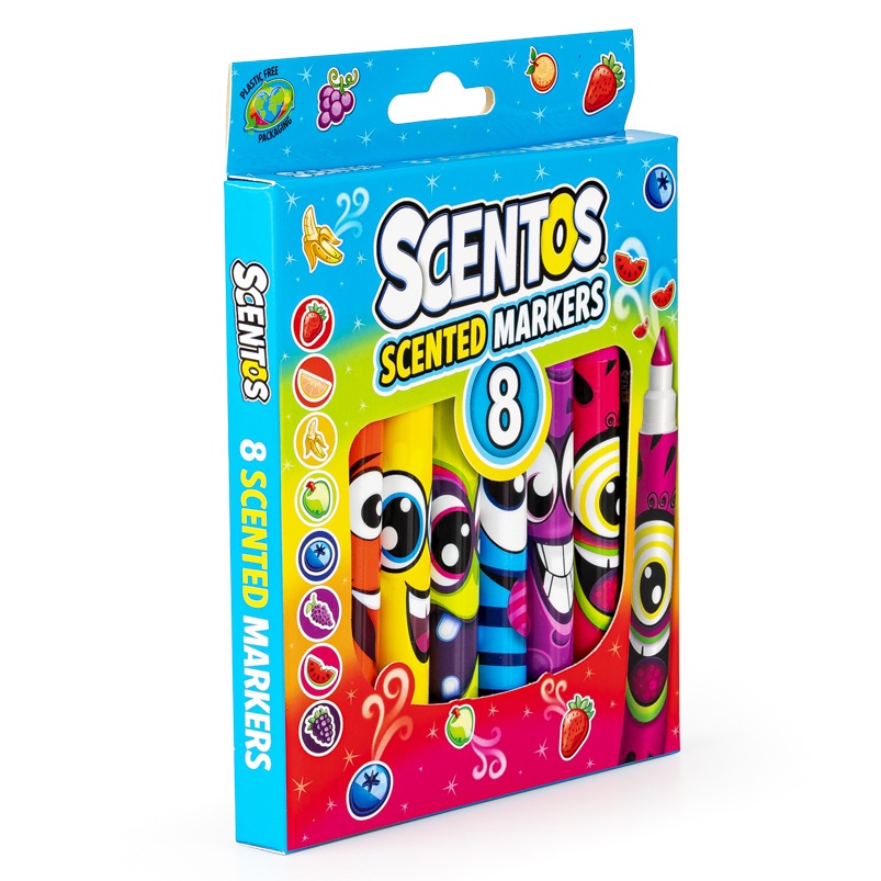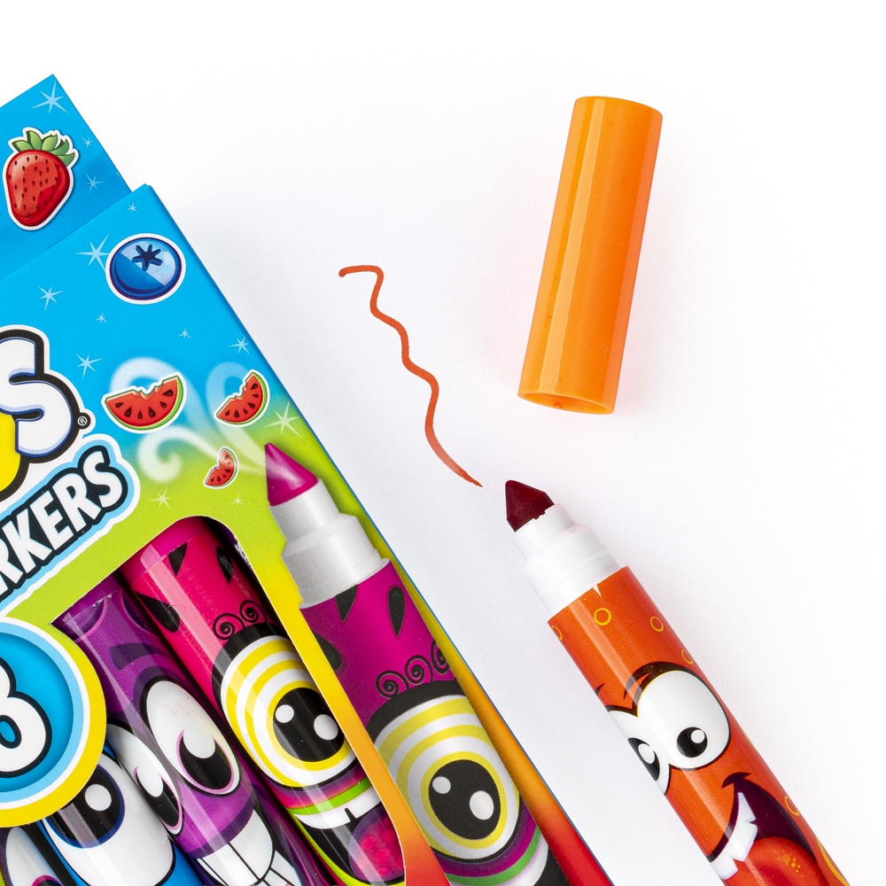 Zbzikowana paczka kolorowych markerów umili rysowanie i pisanie! Markery różnią się kolorem i zapachem, a każdy z wesołych mazaczków zdobi inna, roześmiana buźka. Poszczególnym kolorom odpowiada zapach nawiązujący do owocu w tym samym kolorze.
