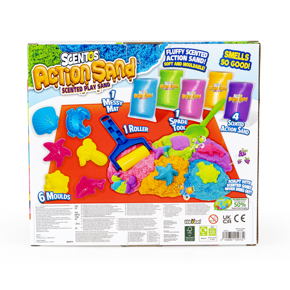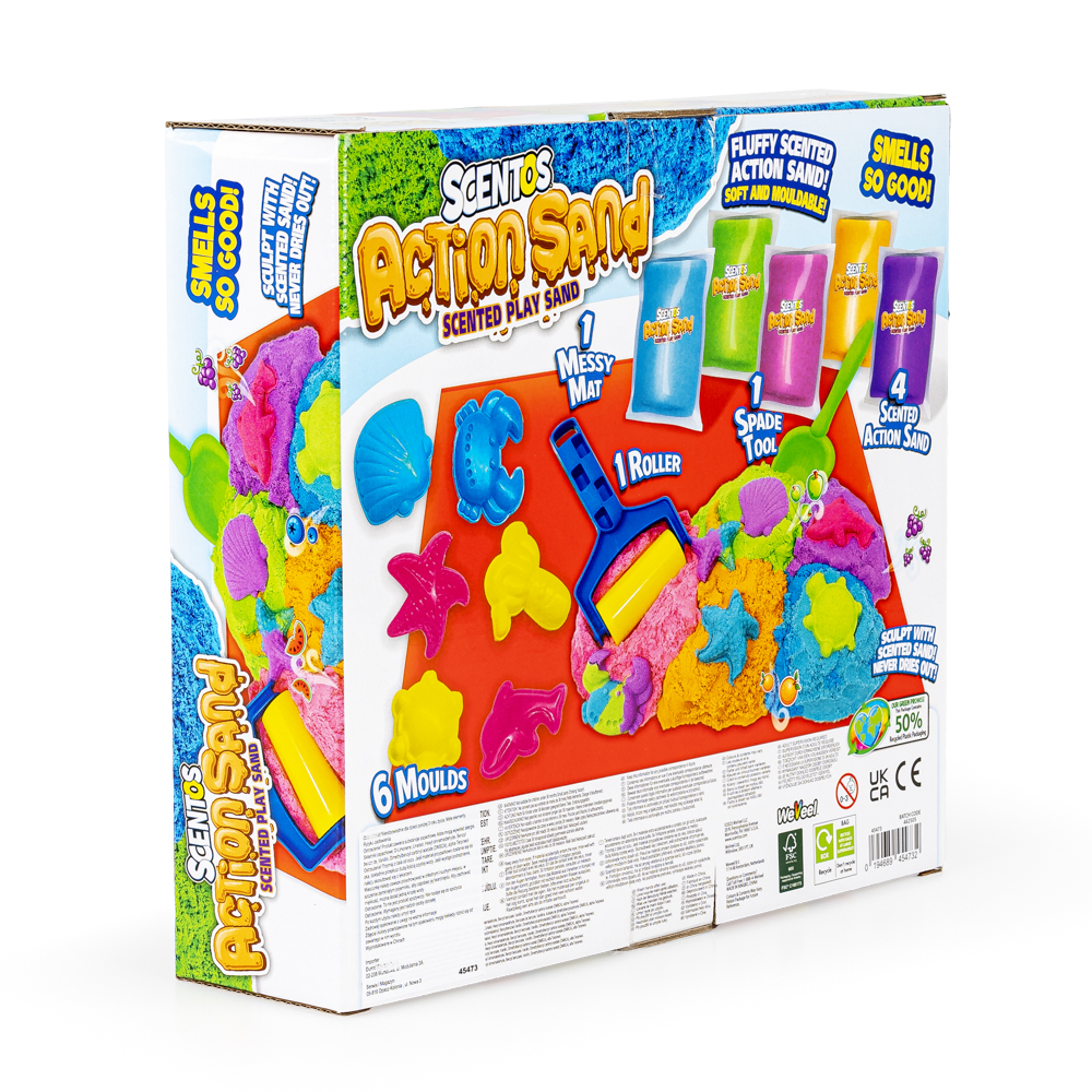 - w zestawie pachnący piasek kinetyczny w pięciu kolorach i 6 plastikowych foremek;