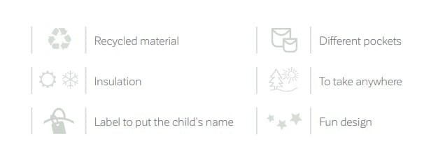 Tkanina użyta do wykonania plecaka pochodzi z plastiku pochodzącego z recyklingu (rPET), a wewnętrzna warstwa izolacyjna pomaga utrzymać temperaturę i chroni dziecięce obiady i przekąski przed zmianami temperatury.