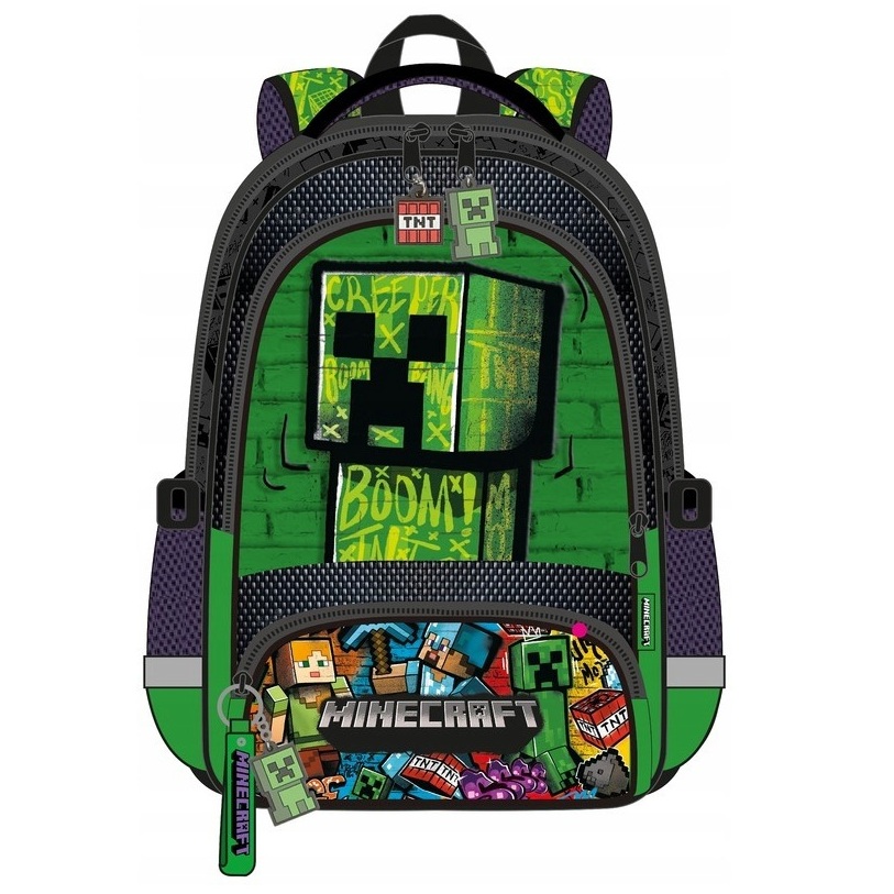 Weź ulubione postacie wszędzie ze sobą! Oficjalnie licencjonowany plecak z motywami z gry Minecraft to połączenie praktyczności i wyjątkowego designu. Wyjątkowy design – motyw Creepera, TNT i grafik w stylu Minecraft z efektem 3D.