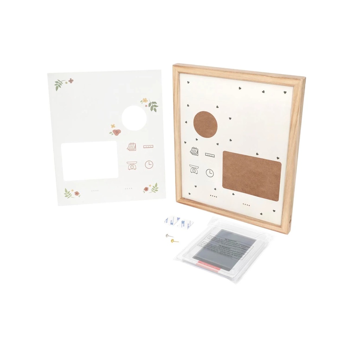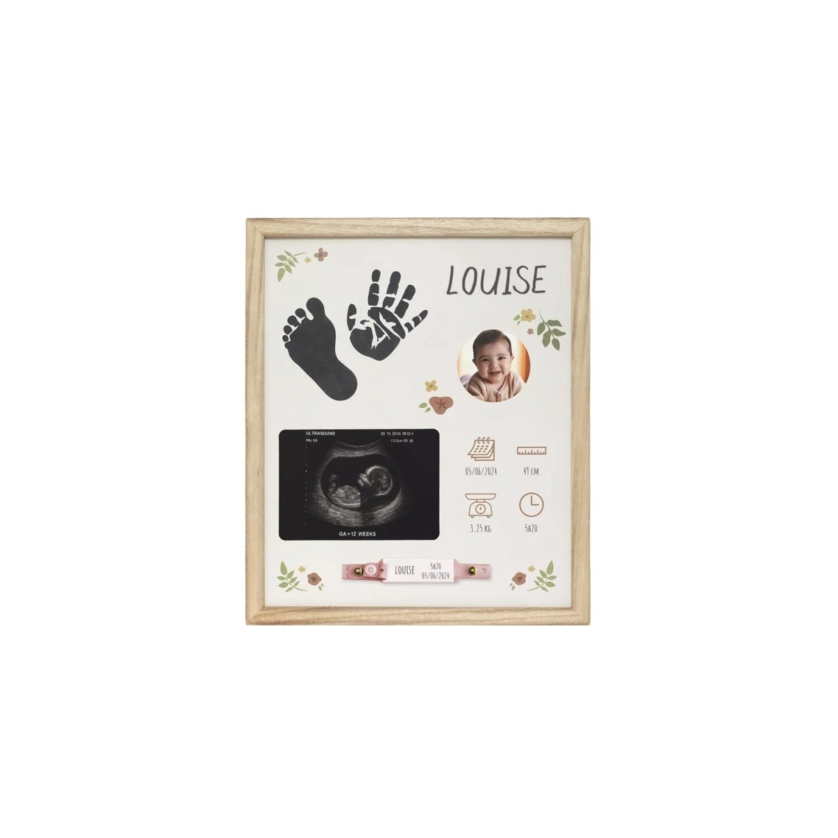 Wykonaj odciski stóp lub dłoni dziecka za pomocą dołączonej farbki (bez bezpośredniego kontaktu farby ze skórą). Umieść w ramce zdjęcie, echografię USG oraz szpitalną opaskę. Wybierz wzór tła i ciesz się wyjątkową dekoracją pełną emocji.