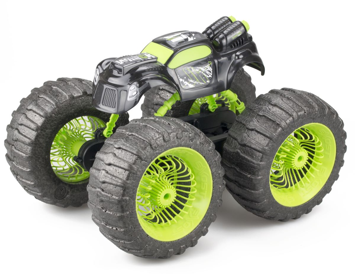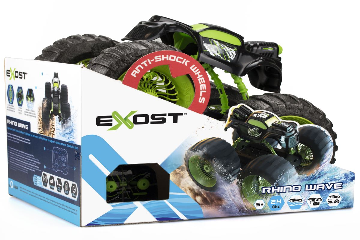 Potężne, antywstrząsowe koła poradzą sobie z niewielkimi przeszkodami, a wodoodporny korpus i para turbin, pozwolą korzystać z autkiem nie tylko na suchej powierzchni, ale także w wodzie. Pojazd działa na częstotliwości 2,4 GHz, a steruje się nim za pomocą dołączonego pilota.